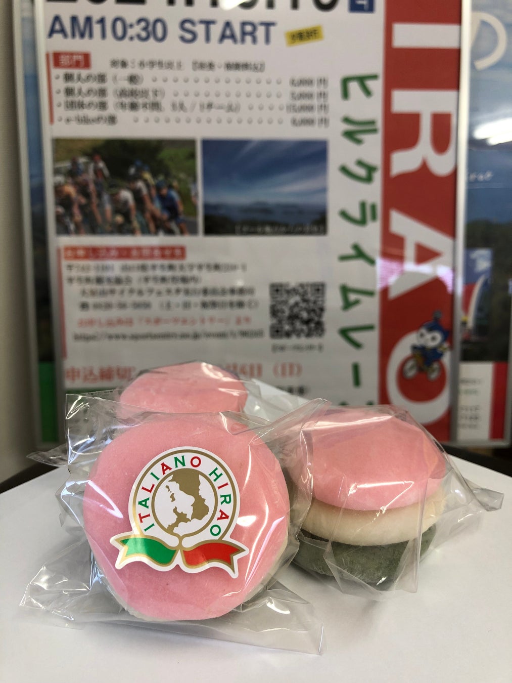 そこで、今回10回目となる節目の大会で、選手の皆様に感謝の気持ちを込めて、日本ではめでたい、お祝い、縁起が良いという意味で提供されている紅白餅をトリコローレカラー(紅・白・緑)に仕上げお配りする予定です。この大会をきっかけに、平生町の祝い事をする際のお餅は、「イタリア~ノひらお」ならではの「トリコローレ餅」になればと、大星山サイクルフェスタ実行委員会事務局に関わっている地域おこし協力隊の想いが込められています。