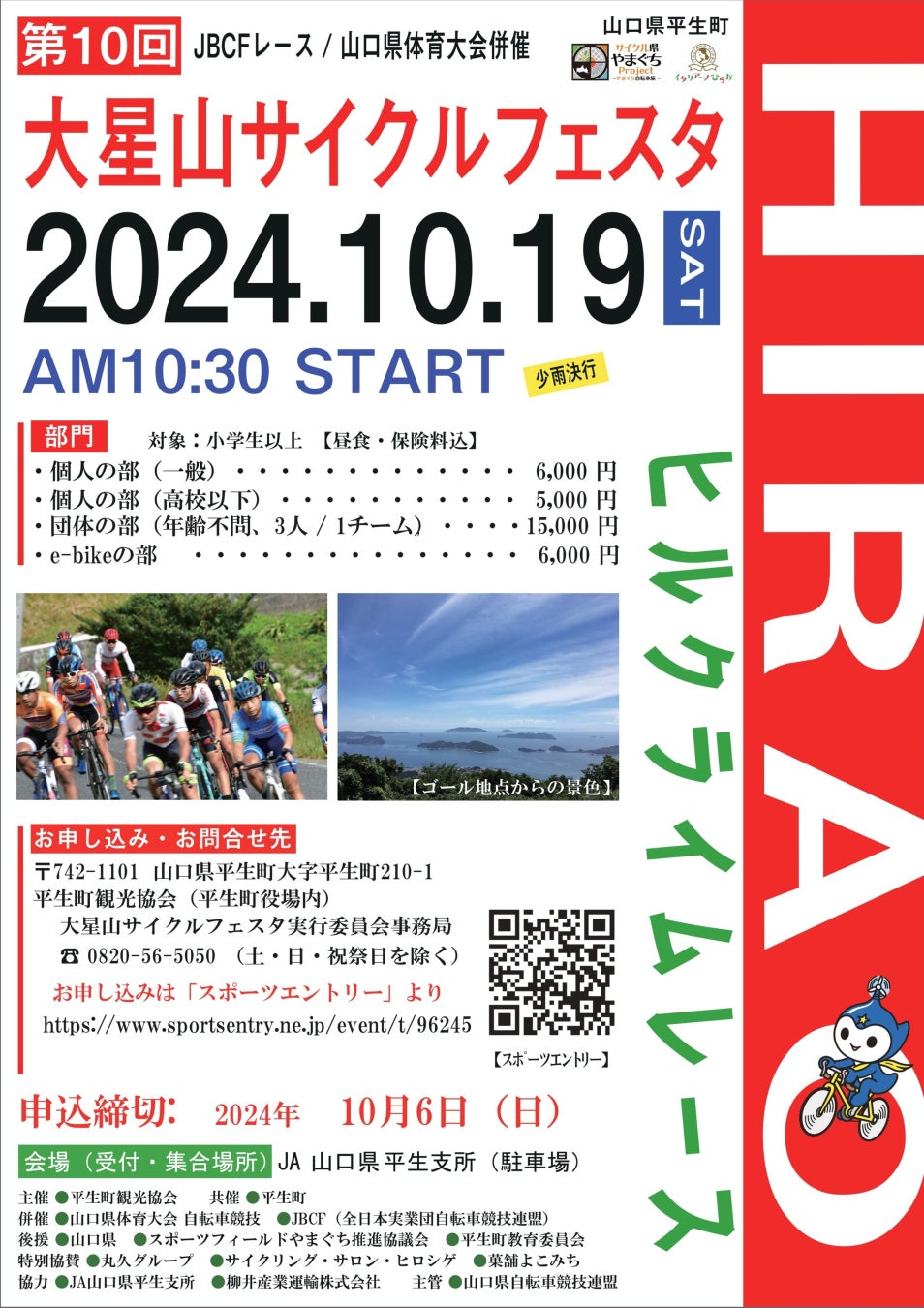 「大星山サイクルフェスタinひらお」は、レースとしてタイムを競う選手、自分自身に挑戦する選手、大星山山頂から観える景色を楽しむ選手など、参加者の目的が三者三様で、いろいろな楽しみ方ができる大会です。また、JBCF(全日本実業団自転車競技連盟)レースや山口県スポーツ大会が併催されていることも特徴の一つとなっています。