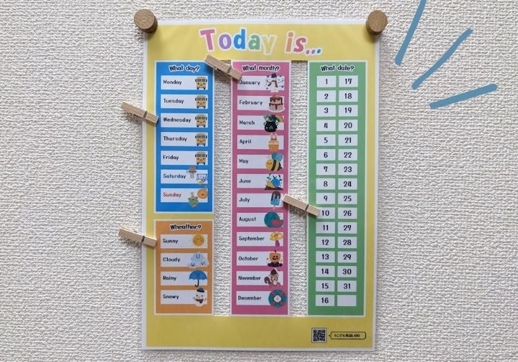 毎日習慣的に【曜日/月の名前/日付/天気】の英語を目にしたり声に出したりすることで、自然に覚えられます。