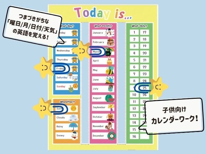 そんな「曜日/月/日付」の英語を小学生でも「手軽に」「楽しく」学べるカレンダーワークを作りました!(おまけで天気もつけました^^)
