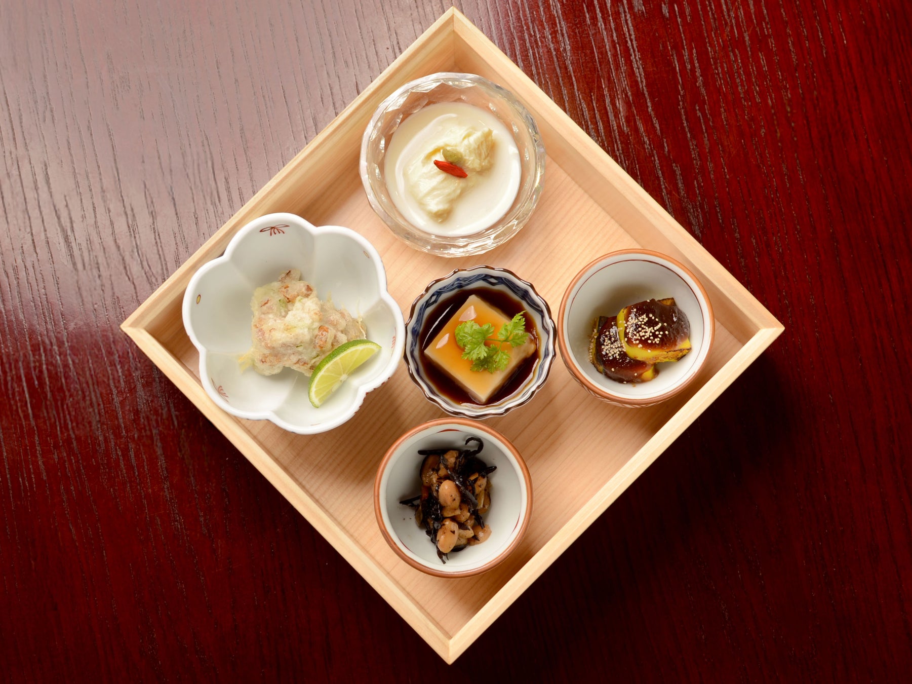豆腐には大粒で甘みのある宮城を代表する大豆の優良品種「ミヤギシロメ」を使用し、地元「湯河原 十二庵」で丹精込めて仕上げられた絹ごし豆腐と木綿豆腐をご用意、それぞれの口当たりや食感を味わっていただけます。