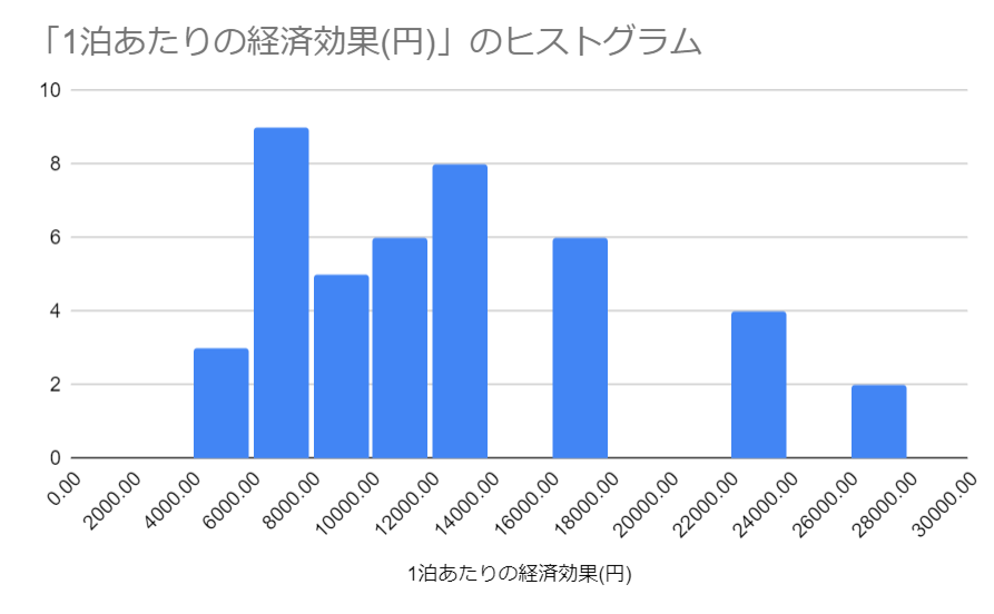 通常旅行者23人の自治体の交通費負担額は108,669円だったのに対して、直接経済効果総額は約450,000円となり、交通費負担額の4.14倍の直接経済効果が発生したことがわかりました。1泊あたりの直接経済効果の平均は15,300円となり、中央値は12,500円となりました。