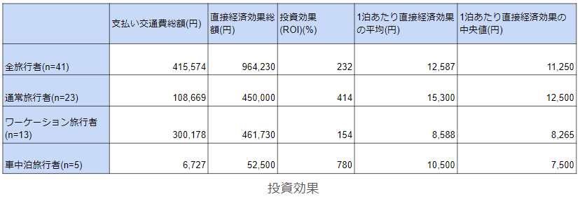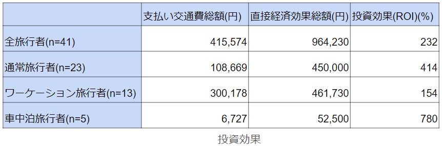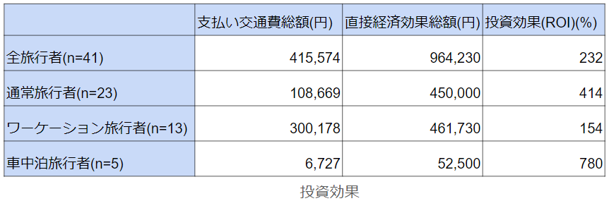 また、ワーケーション旅行者(13人)と車中泊旅行者(5人)を除く通常旅行者(23人)の場合、自治体の交通費負担額は108,669円だったのに対して、直接経済効果総額は約450,000円となり、交通費負担額の4.14倍の直接経済効果が発生したことがわかりました。