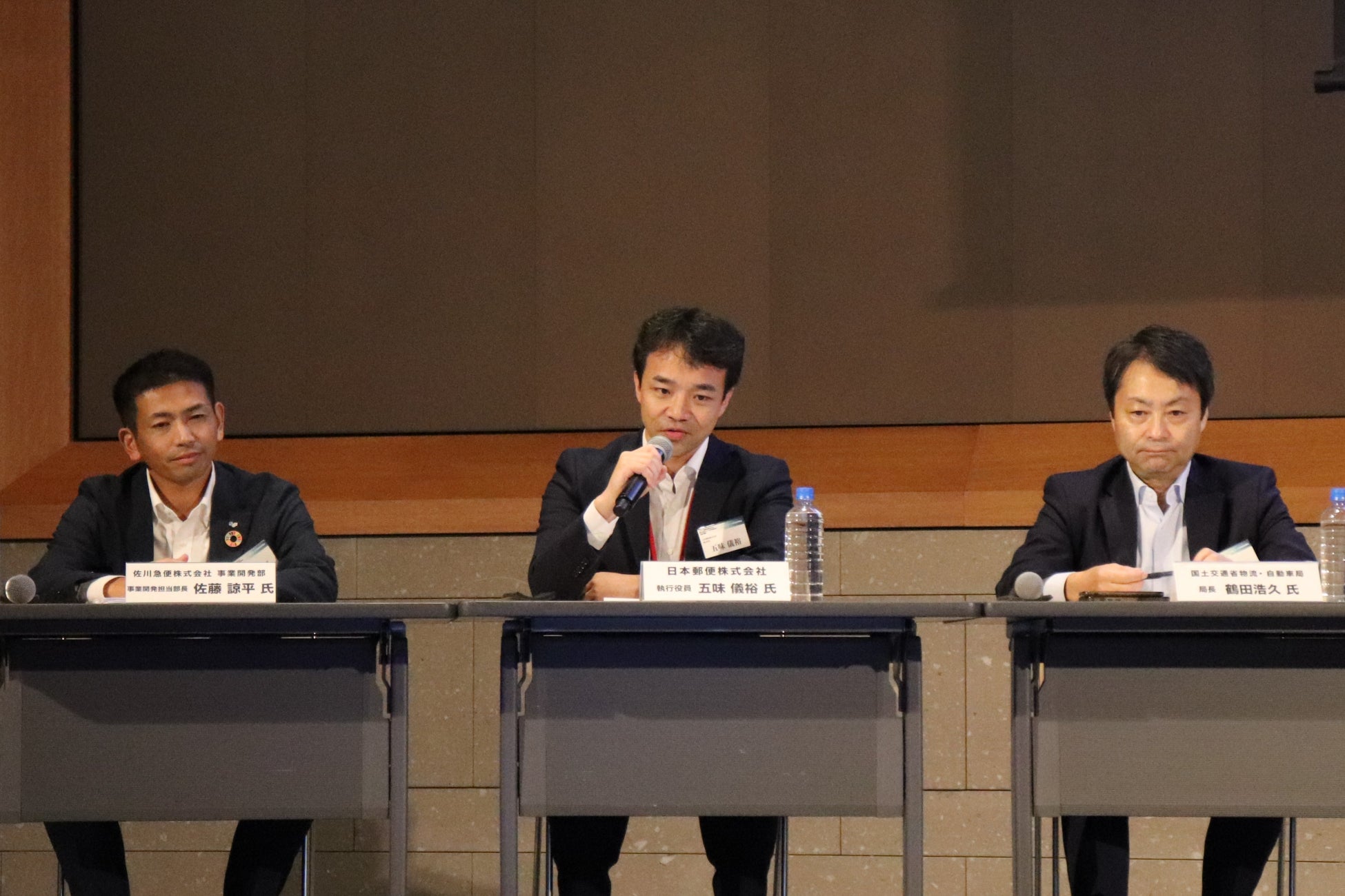 国土交通省 物流・自動車局長 鶴田浩久氏、日本郵便株式会社 執行役員 五味儀裕氏、佐川急便株式会社 事業開発部 担当部長 佐藤諒平氏、セイノーホールディングス株式会社 執行役員 河合秀治氏 (モデレーター、本協議会 理事)によるパネルディスカッション