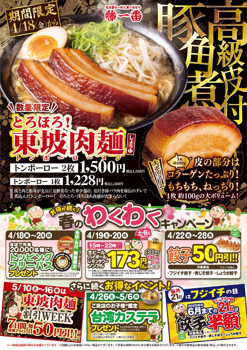 【名古屋らーめん藤一番】あの話題のメニューが今年も!年3回だけの特別メニューとして登場!|4/18~トッピングが何度でも無料になるフリーパスプレゼントや餃子・ビールがお得!春のキャンペーンを開催!