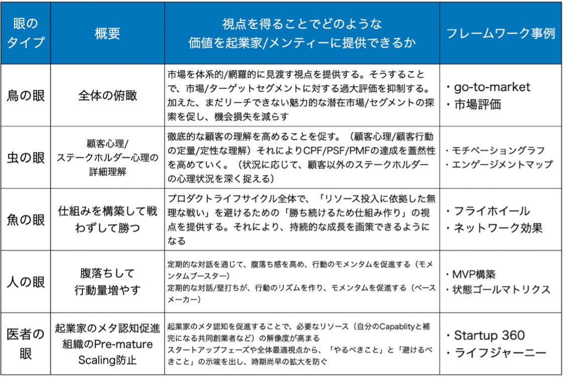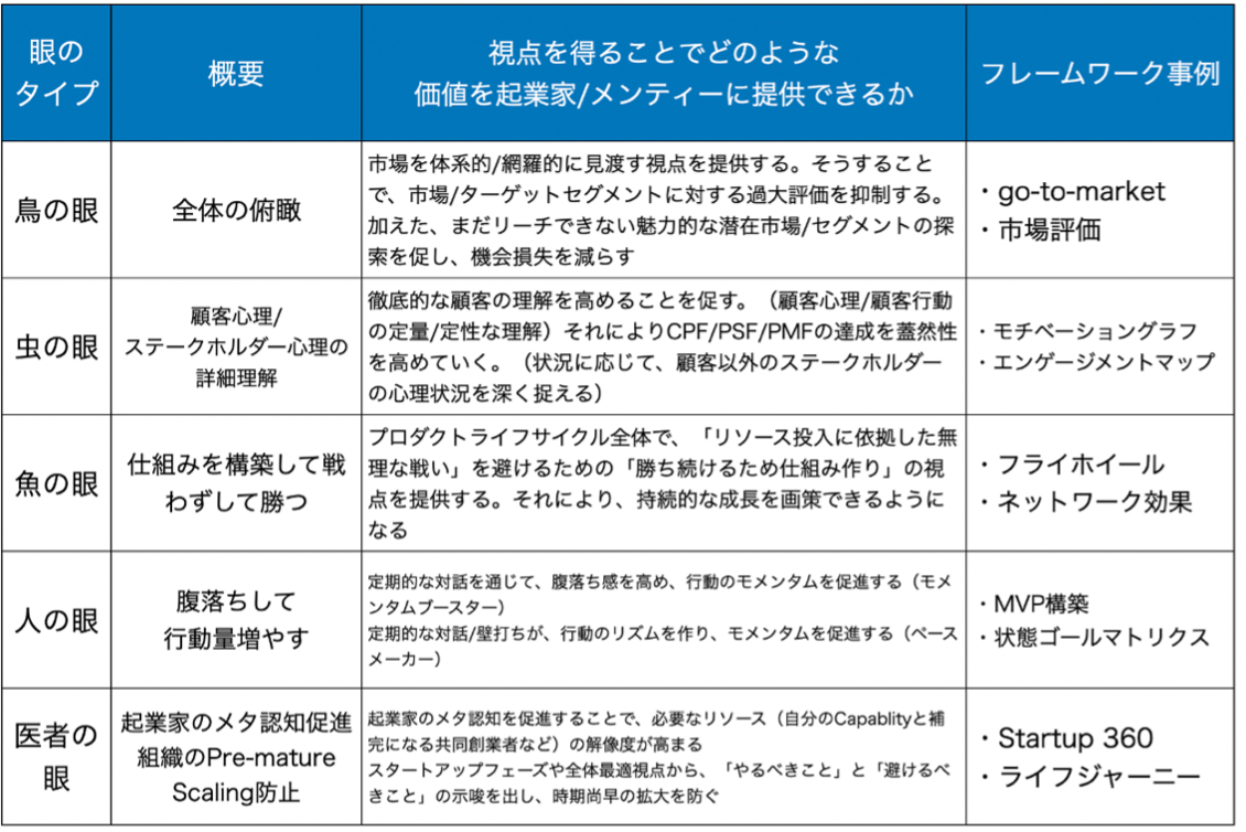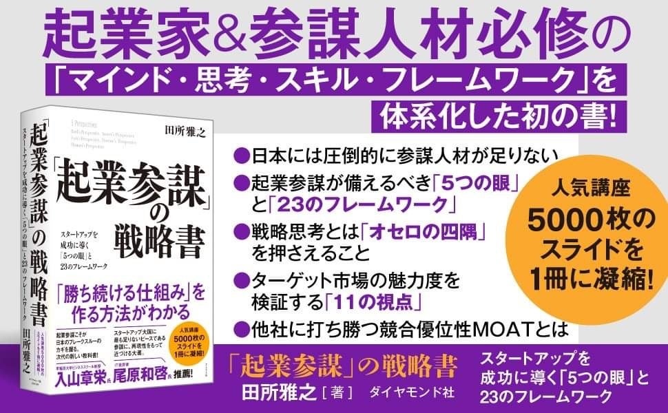 本書は、これまでに起業家や事業開発を支援する起業参謀(スタートアップアドバイザー)を計150名以上輩出してきた人気講座のSAA(Startup Advisor Academy)の内容を凝縮した一冊であり、特にスタートアップを成功に導く「5つの眼」と23のフレームワークを詳細に解説し、スタートアップや事業開発の支援者がすぐに実行・実践に移すことができる内容になっています。