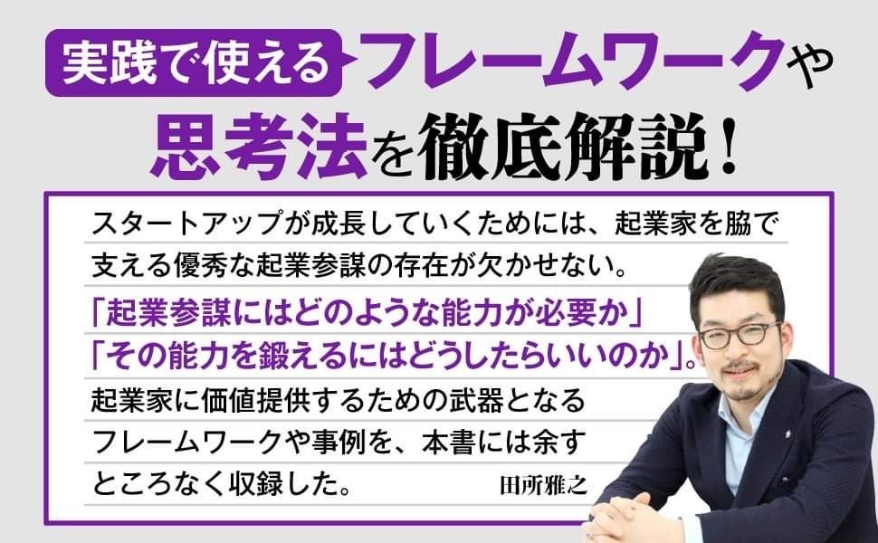 “スタートアップする”際に重要なことは、「一時の勢いで勝つだけではなく、長く勝ち続ける仕組みを作ることだ」と田所雅之は本書で述べています。どれほど優れた起業家・新規事業担当者でも、1人の力で勝ち続けられません。事業・企業が大きく成長するためには、起業家のかたわらでそれを支える存在が欠かせないのです。