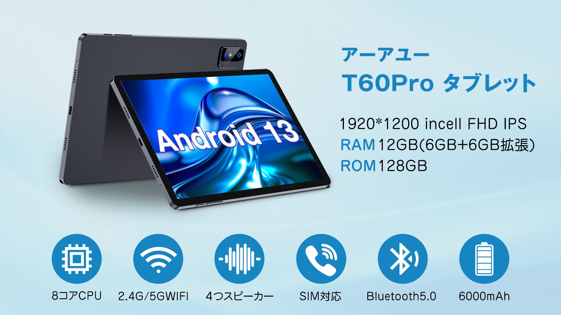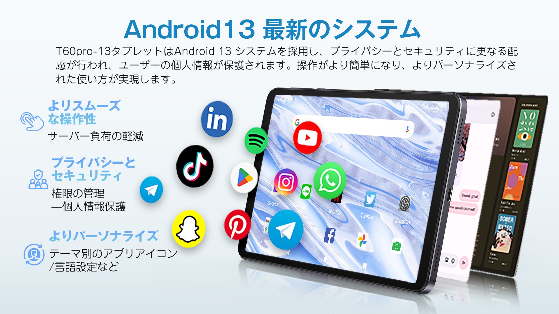 T60 Pro android タブレットは、最新のAndroid 13システムを採用し、よりパーソナライズ、より安全なシステムを提供します。高性能な8コアCPUを搭載し、快適な操作や高速処理が可能です。また、Googleモバイルサービス認証を取得しており、Google Playストアから、Netflix、TikTok、YouTube、LINE、Facebook、Twitter、Skypeなどのアプリを無料でダウンロードしてお楽しみいただけます。煩わしい広告を取り除くこともできます。