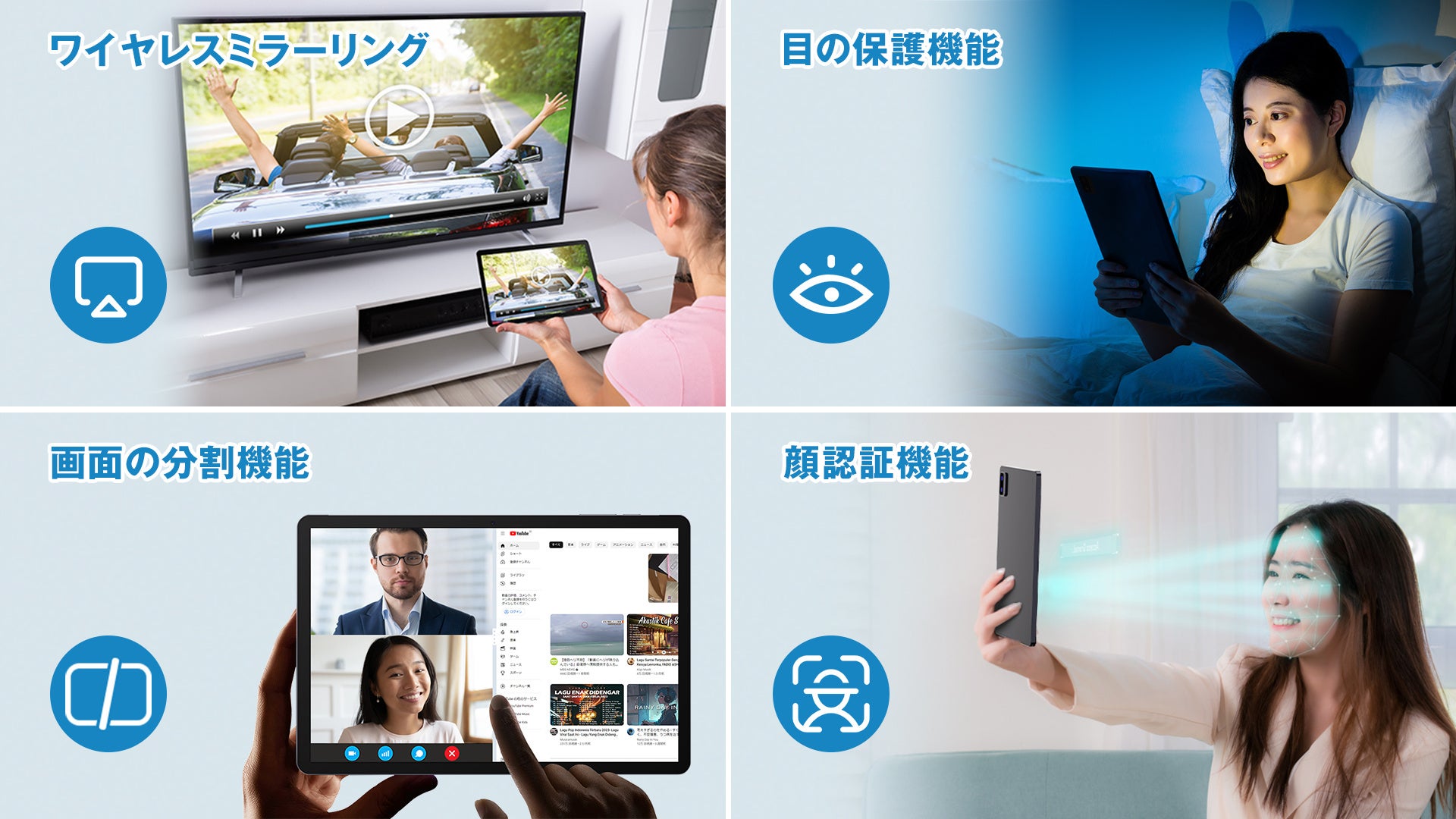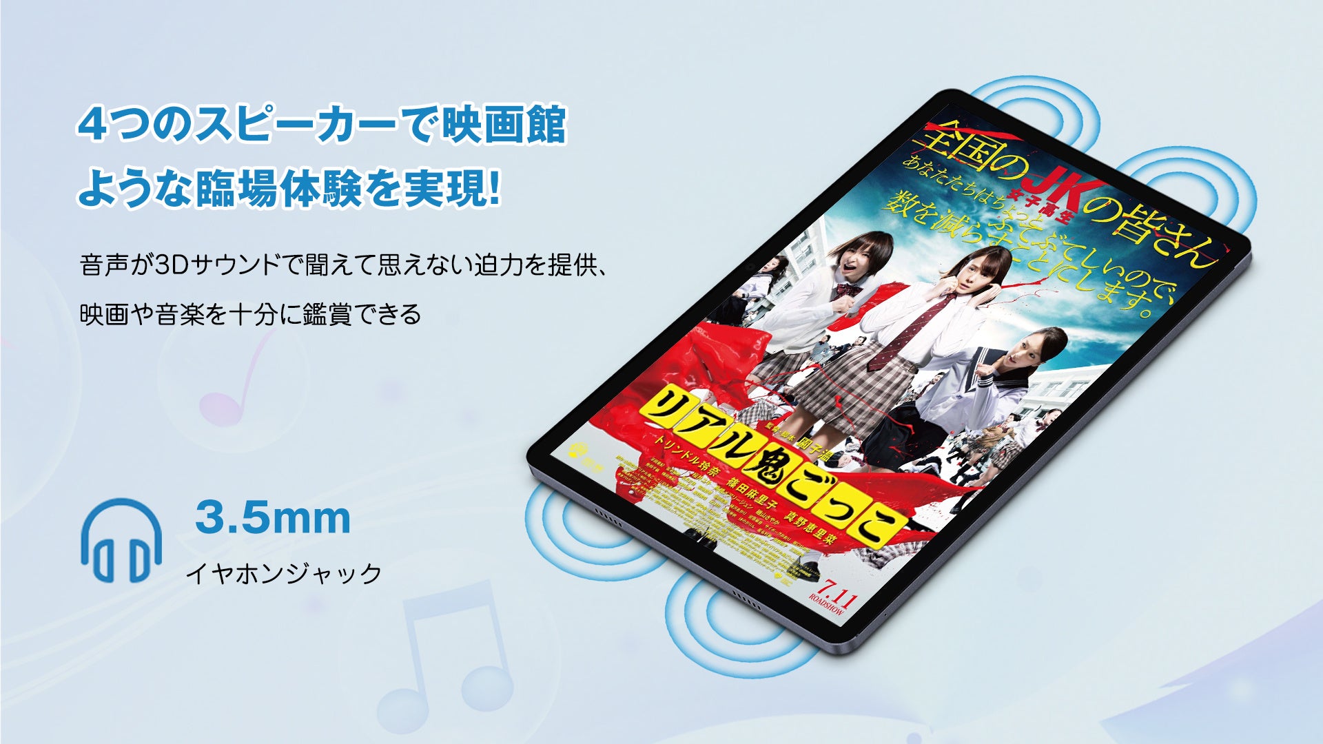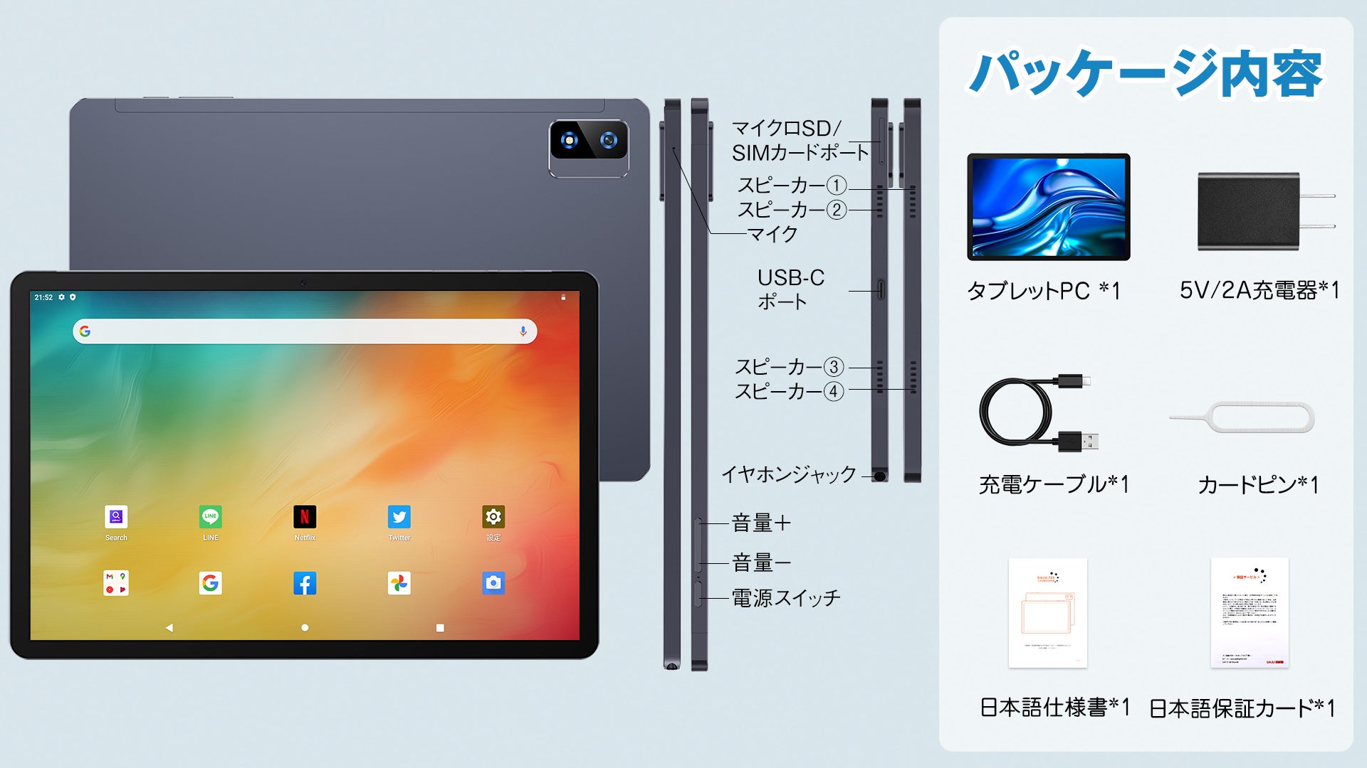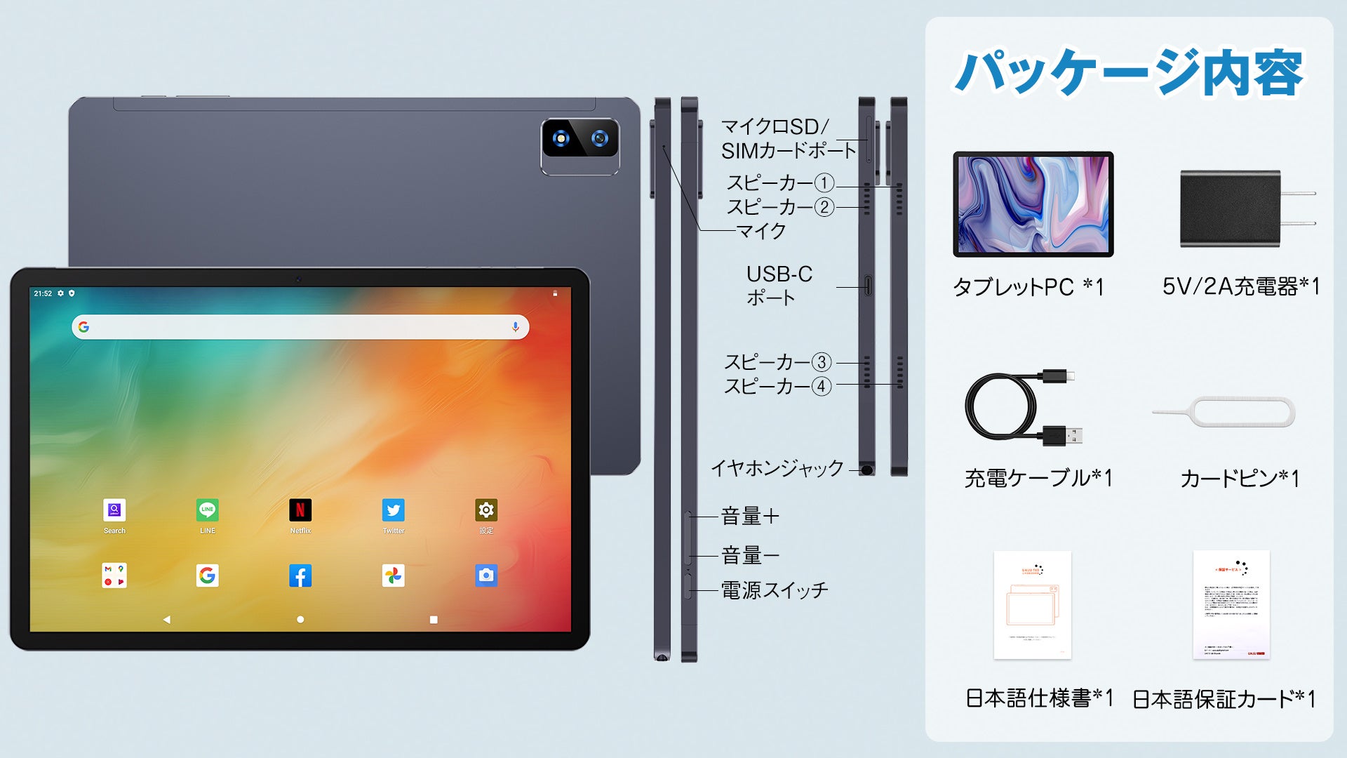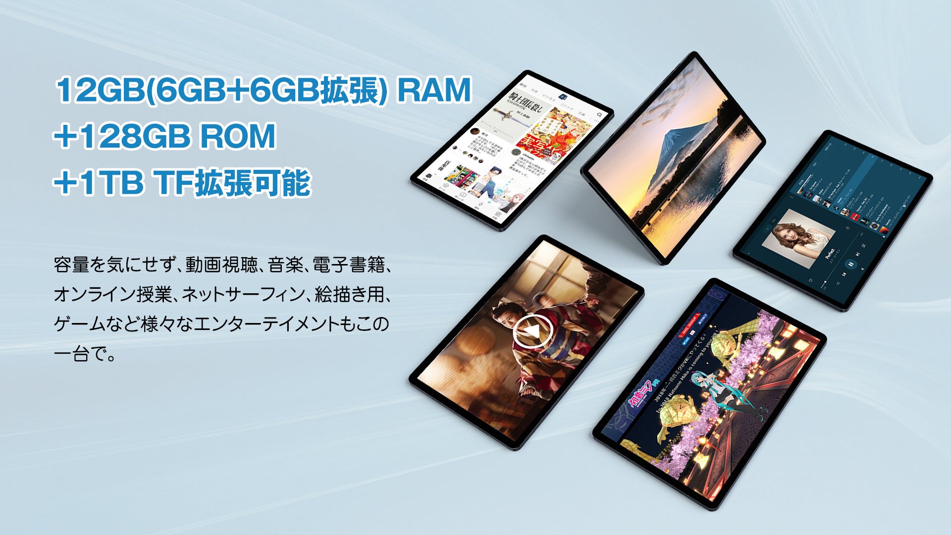 10インチ/ 8コアCPU/incell 1920*1200 FHD/RAM: 12GB(6GB+6GB拡張)/ROM: 128GB+1TB TF拡張/4G LTEモデル+Wi-Fiモデル/6000mAh+18W USB-PD急速充電/顔認識/GPS機能/Widevine L1