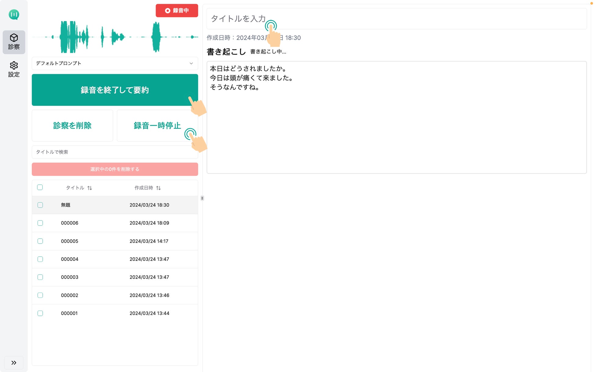 録音開始/停止、要約生成、診察ID設定などを最小限の操作で行えるようにしました。