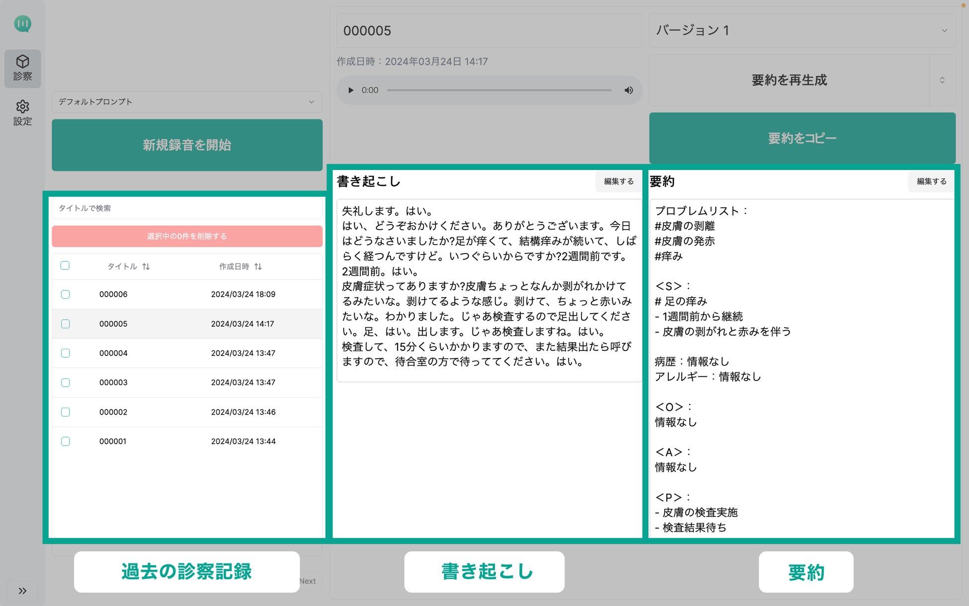 クリニックのオペレーションとのよりシームレスな連携を目指して、UIを中心にアップデートを行いました。具体的には、一般的な電子カルテ画面を模した3画面構成に作り直し、全ての情報を一目で確認可能になりました。また、録音開始/停止、要約生成、診察ID設定などの操作を効率的に行えるようにしました。さらに、当社が独自開発したハードウェアを院内PCに接続することで、オンプレカルテでも手間なくカルテ原稿を安全に転送できるようになりました。
