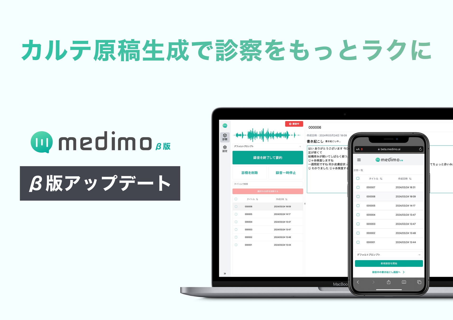 【医療DX】音声入力とAI要約でカルテ作成業務を楽にする「medimo」、大型機能アップデート及び糖尿病内科専用AIを提供開始