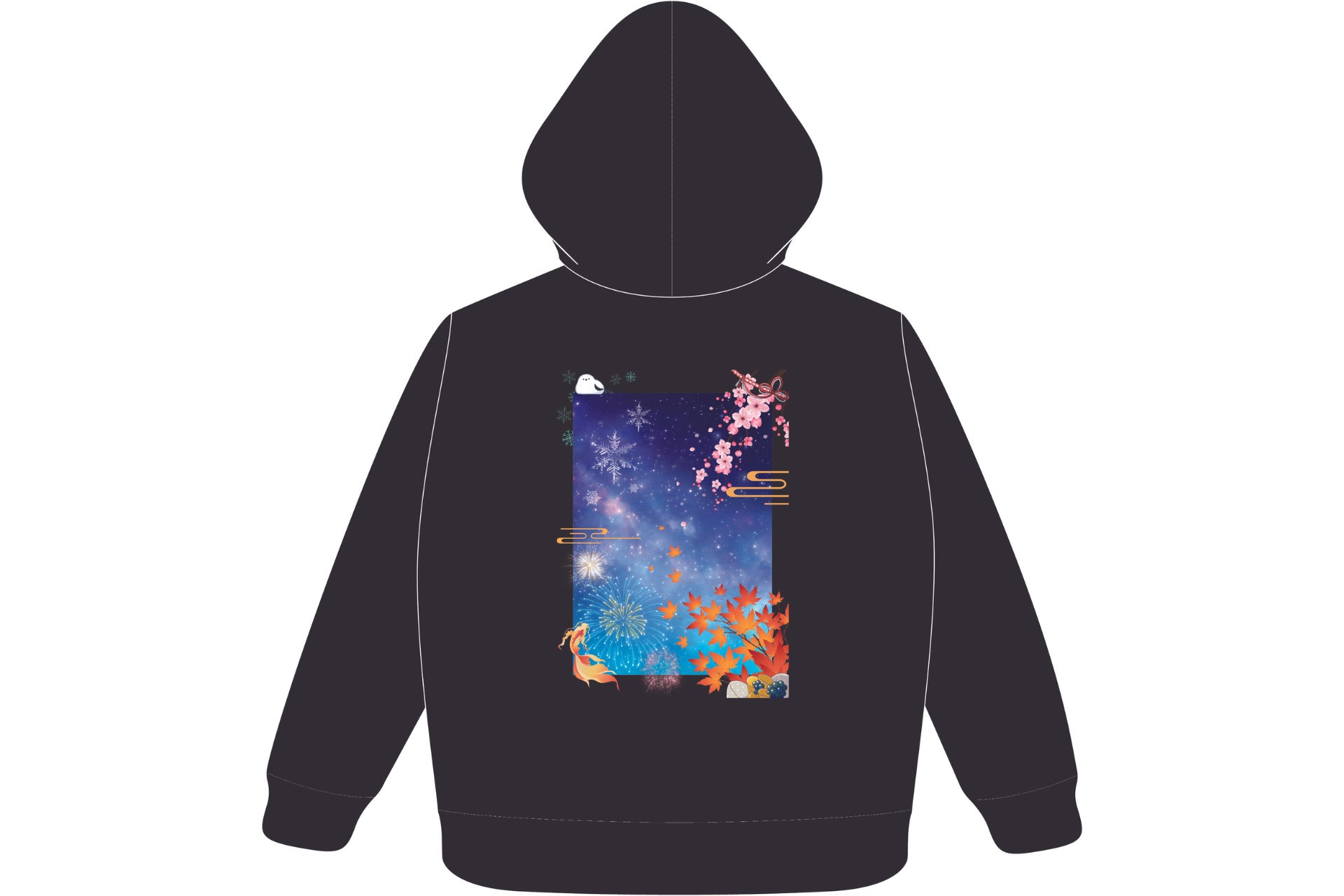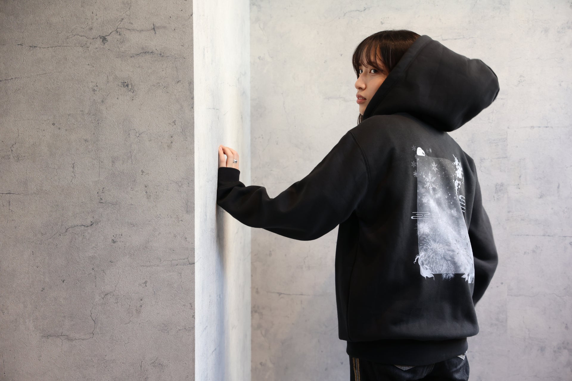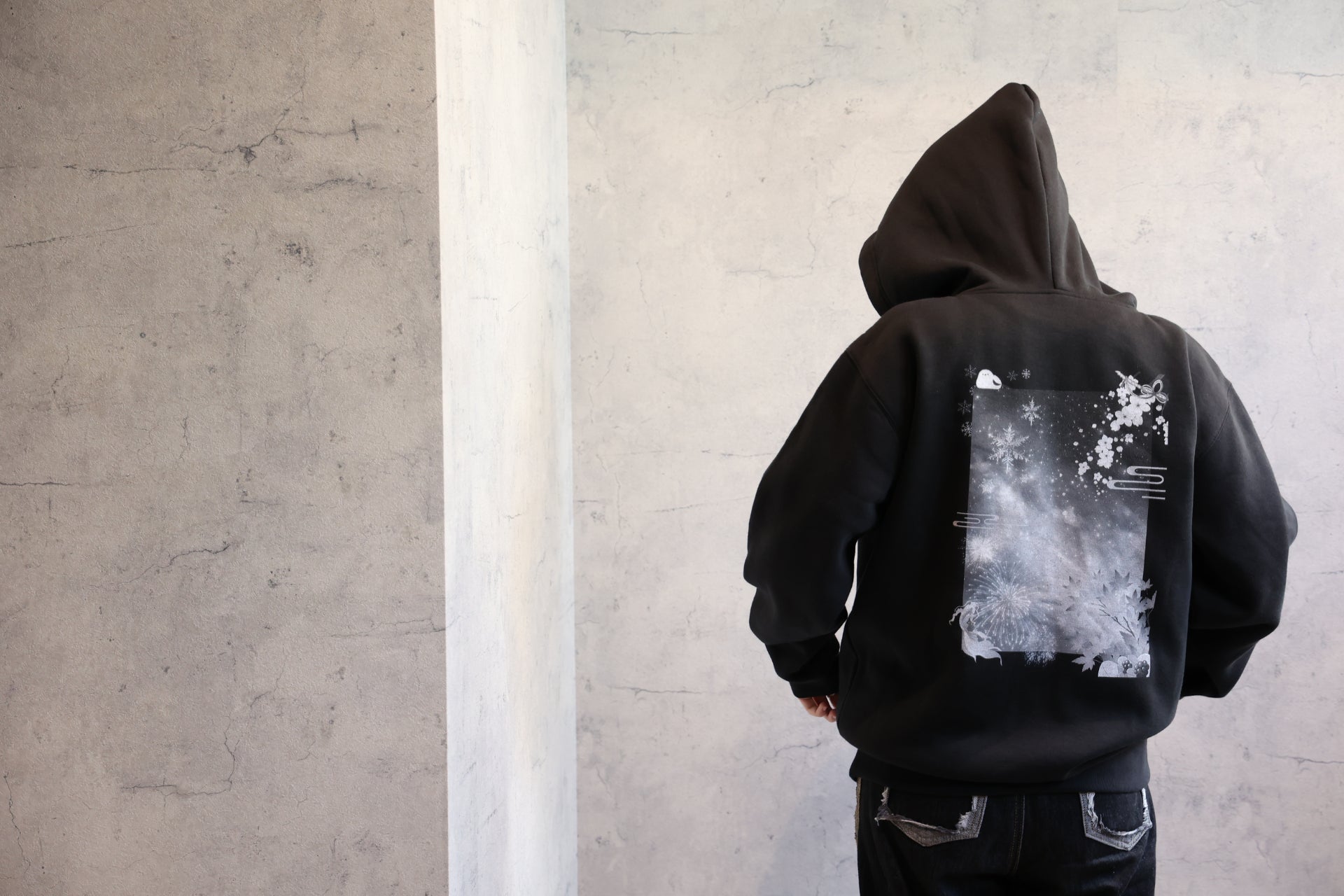 なお、画像①、②でモデルが着用しているパーカーの背面プリントはモノクロですが、実際の商品は画像④、⑤のようにカラーとなりますのでご注意ください。