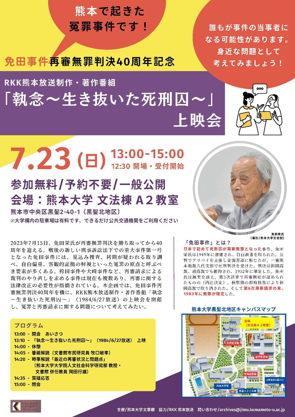 熊本大学文書館では、本学の歴史に関する資料に加え、社会的にも関心が高い免田事件に関する資料の収集・保存・公開を行っています。このたび本館では、免田事件再審無罪判決40周年を機にRKK熊本放送制作・著作番組「執念~生き抜いた死刑囚~」(1984/6/27放送)の上映会を開催いたします。