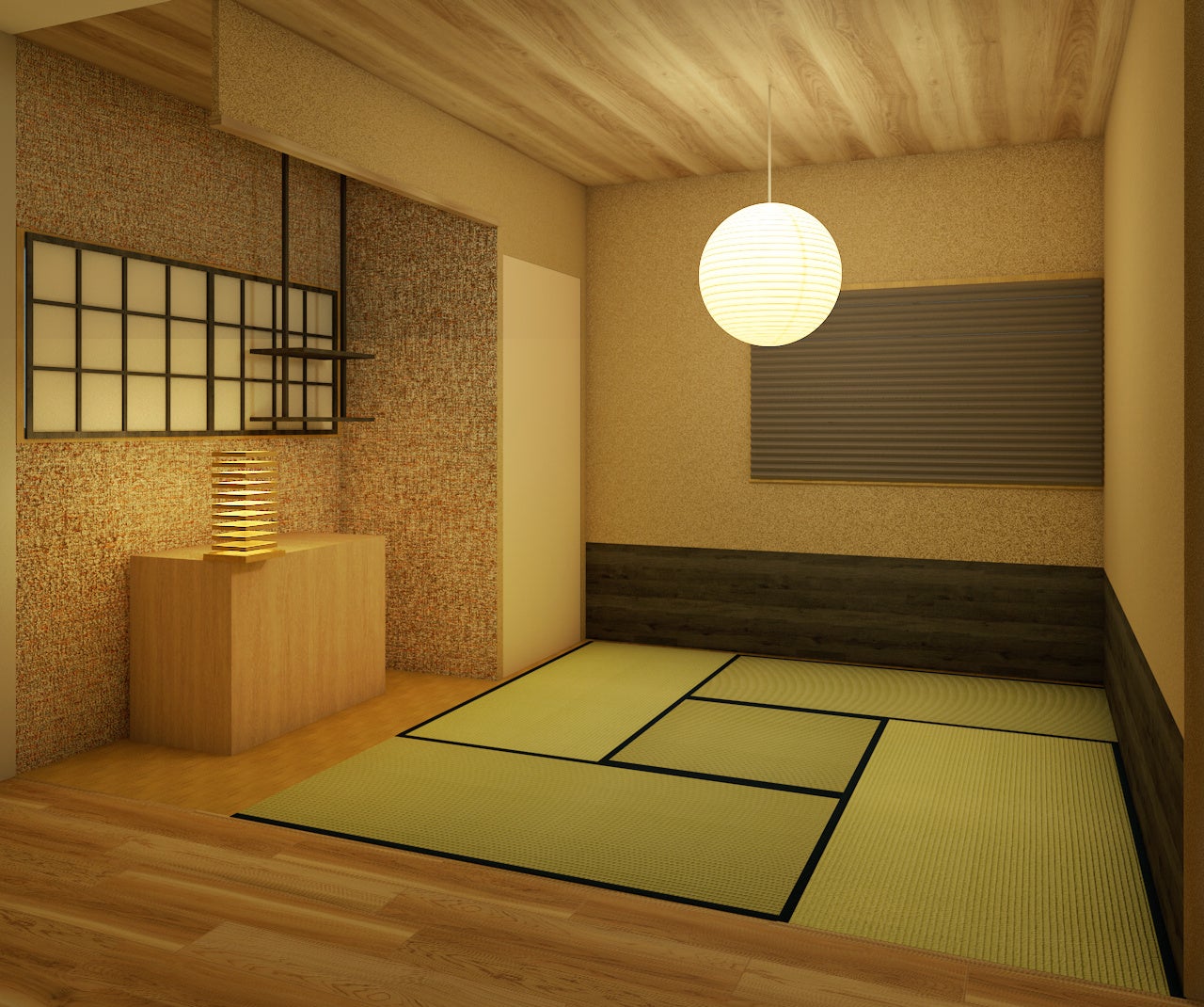 和室: 茶室の要素として、腰壁や畳の敷き方、釣り棚を導入。畳は天然の畳を入れる事で空間をより魅力的に演出。照明スタンドだけの利用で、瞑想ルームとしても機能。