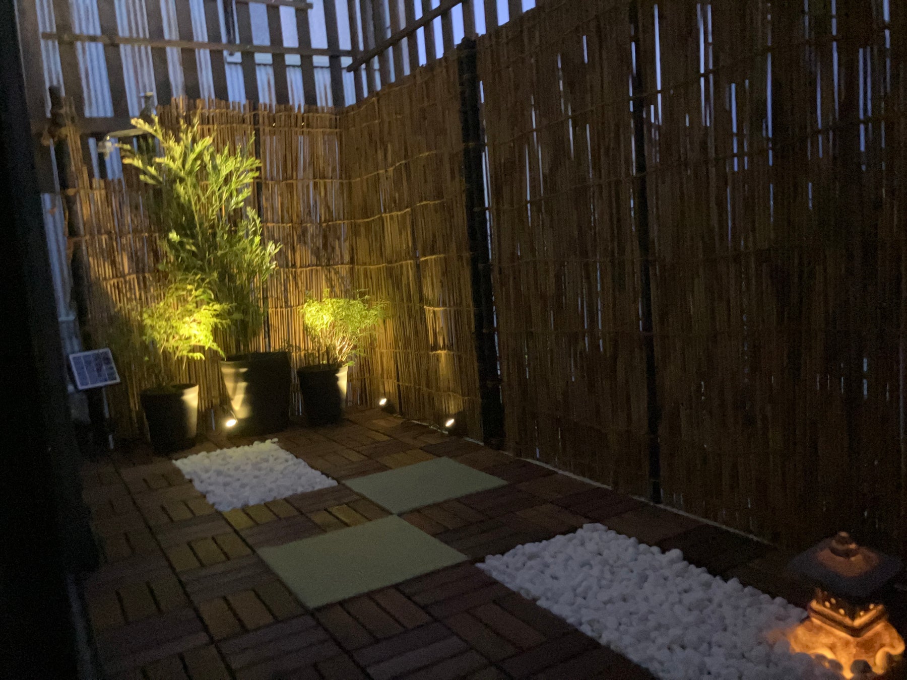 ベランダ:目隠しになるルーバーをランダムに配置。床もタイルパーケット、白石、畳をランダムに配置。畳は人工の素材を配置することで耐久性を持たせる。夜は照明を植栽をライトアップ。