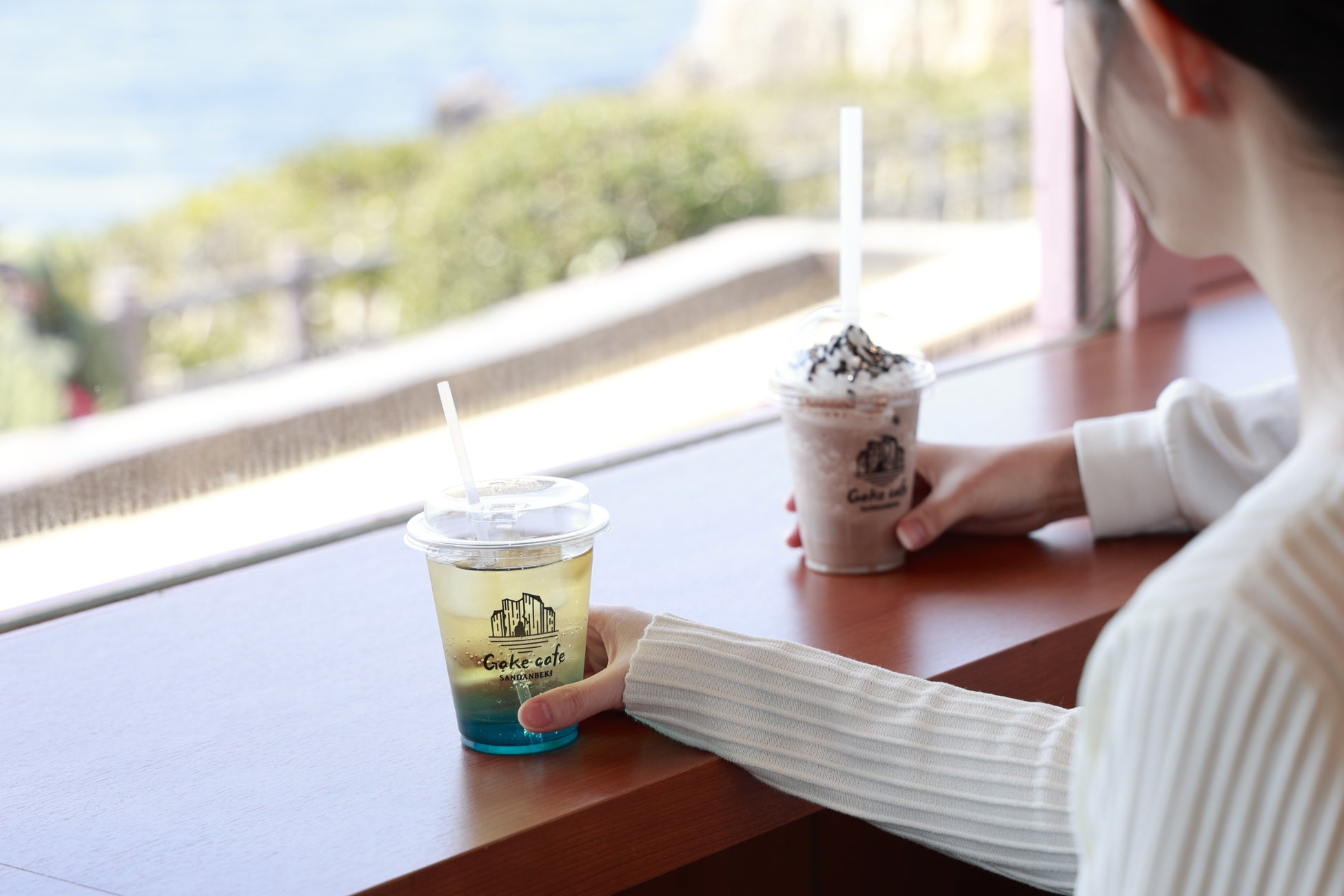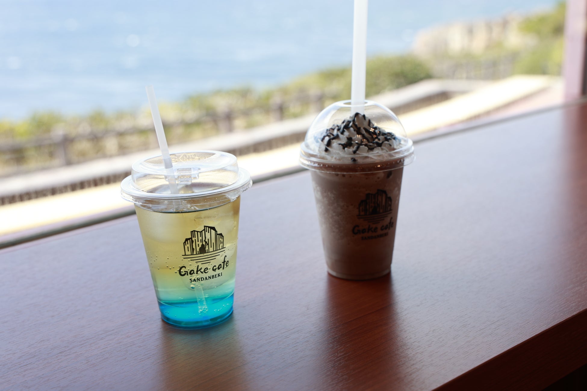 さらに崖cafeオリジナルのサンセットティーソーダは、三段壁の海と夕日をイメージし、見た目も味も爽やかです。他にも、力強いコクと苦味が特徴のエスプレッソとチョコレートを贅沢に使った、こだわりのカフェモカフラッペや、ココアやオレンジジュースなど、お子様にもお楽しみいただけるドリンクもございます。