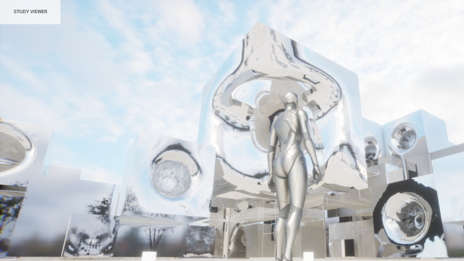 「いのちを磨く」というテーマの元に構想されたパビリオンのコンセプトは「二つの鏡」。建築は全体が有機的に動くミラー膜外装に覆われており、変形しながら風景を歪める彫刻、フィジカルの鏡として未知の風景を映し出します。