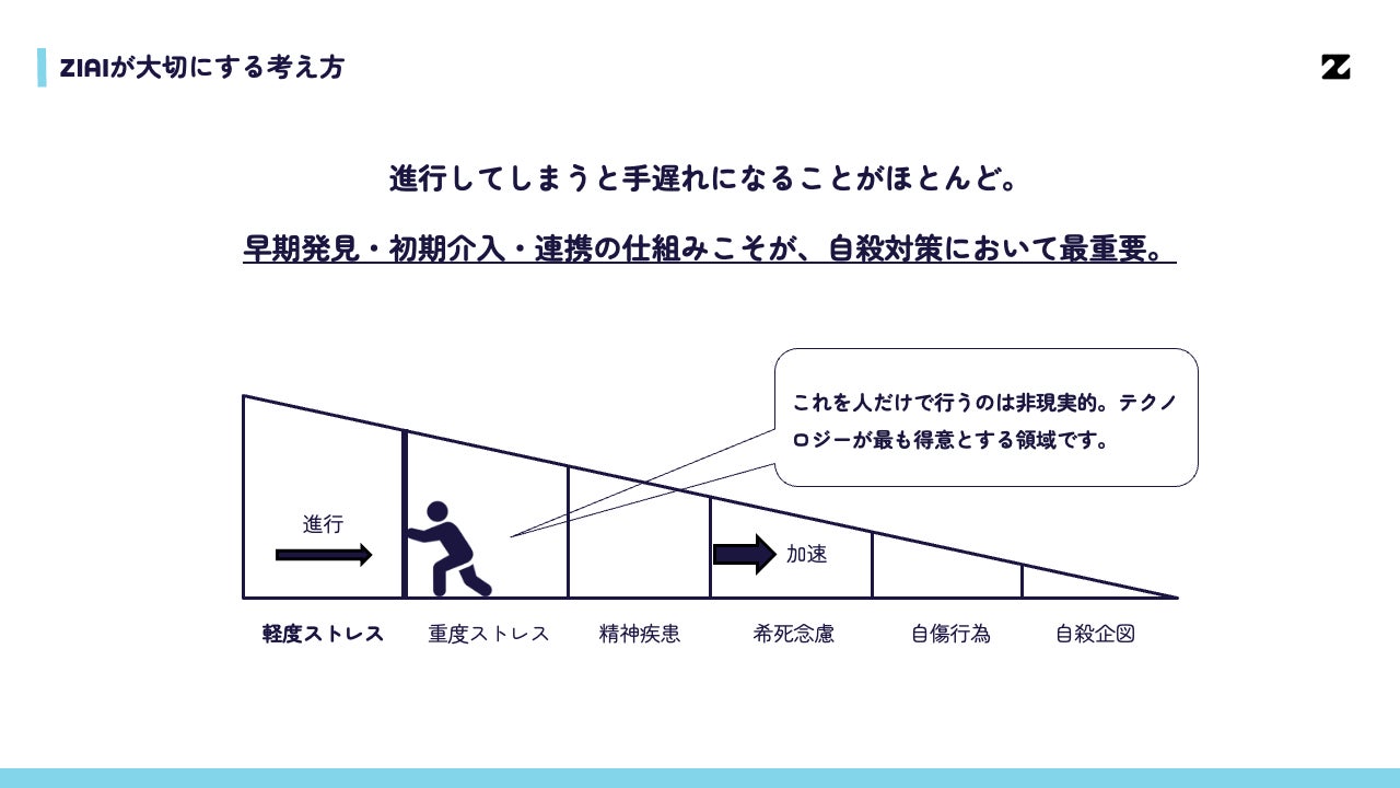 ZIAIは、早期発見と初期介入が自殺予防のカギであるという信念のもと、「一次予防」に注力してきました。これまでにある自治体では、市民から寄せられた延べ10,000件以上の悩み相談に傾聴AIが対応し、平均満足度は82.5%を記録。また、ある学校では親やカウンセラーに相談できなかった生徒たちから50件/月の相談が寄せられ、傾聴AIと対話した後に本人同意のもとで学校に連携し、2件の不登校・自殺予防を実現しました。