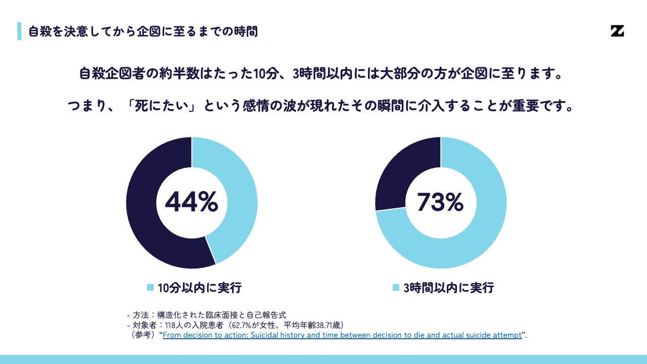 さらに、自殺の企図が決意されてから実行に移るまでの時間を調査した海外の研究では、44%の自殺企図者が10分以内に、3時間以内には73%が行動を起こしていました。つまり、「死にたい」という感情の波が現れてから短時間に危機介入できれば、より多くの命を救う可能性が高いということです。