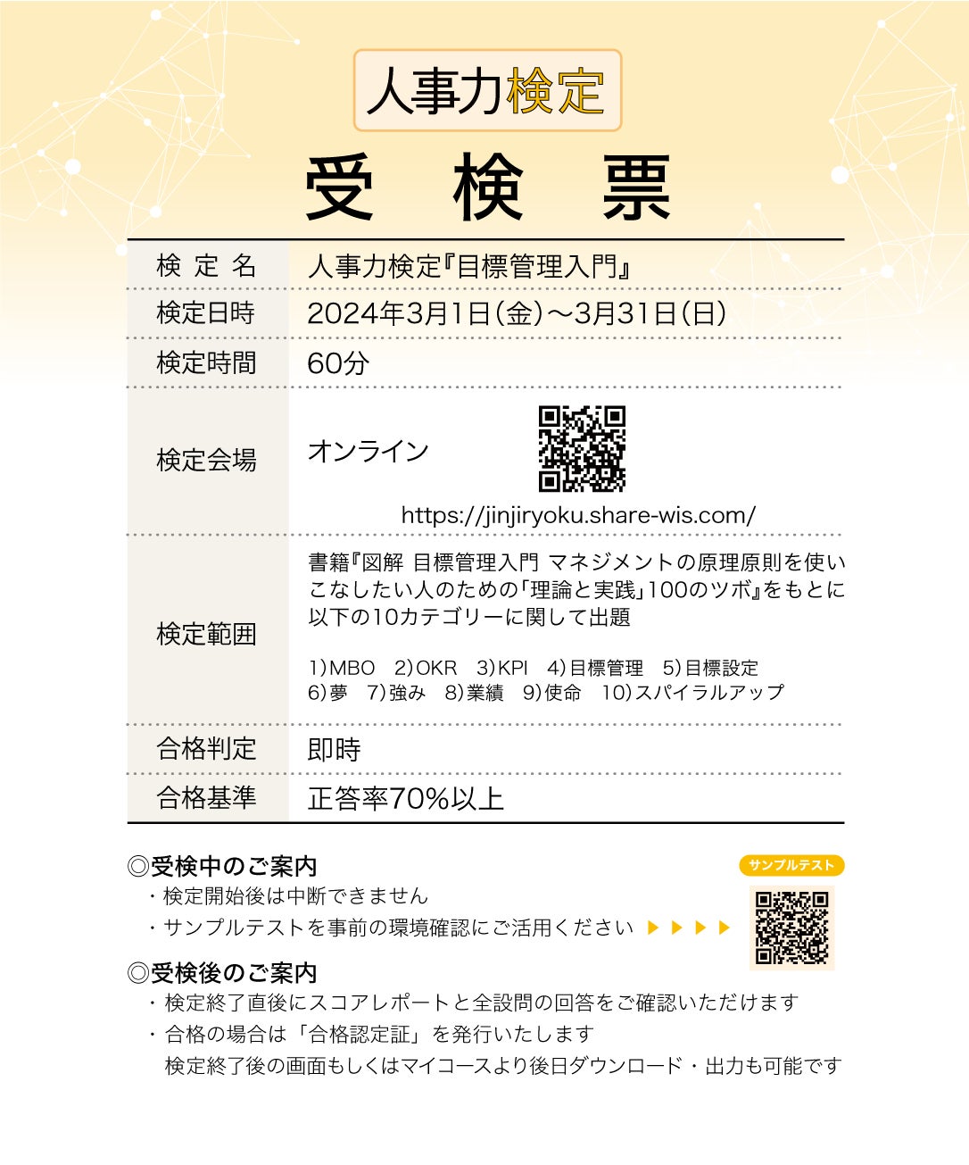 そこでこの度、第2弾「人事力検定『組織開発入門』」に続き、第3弾として「人事力検定『目標管理入門』」を開始いたします。第1回の申込期間は2024年2月1日(木)から3月31日(日)、受検期間は3月1日(金)から3月31日(日)で、オンライン受検となります。