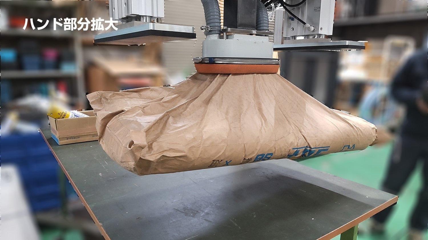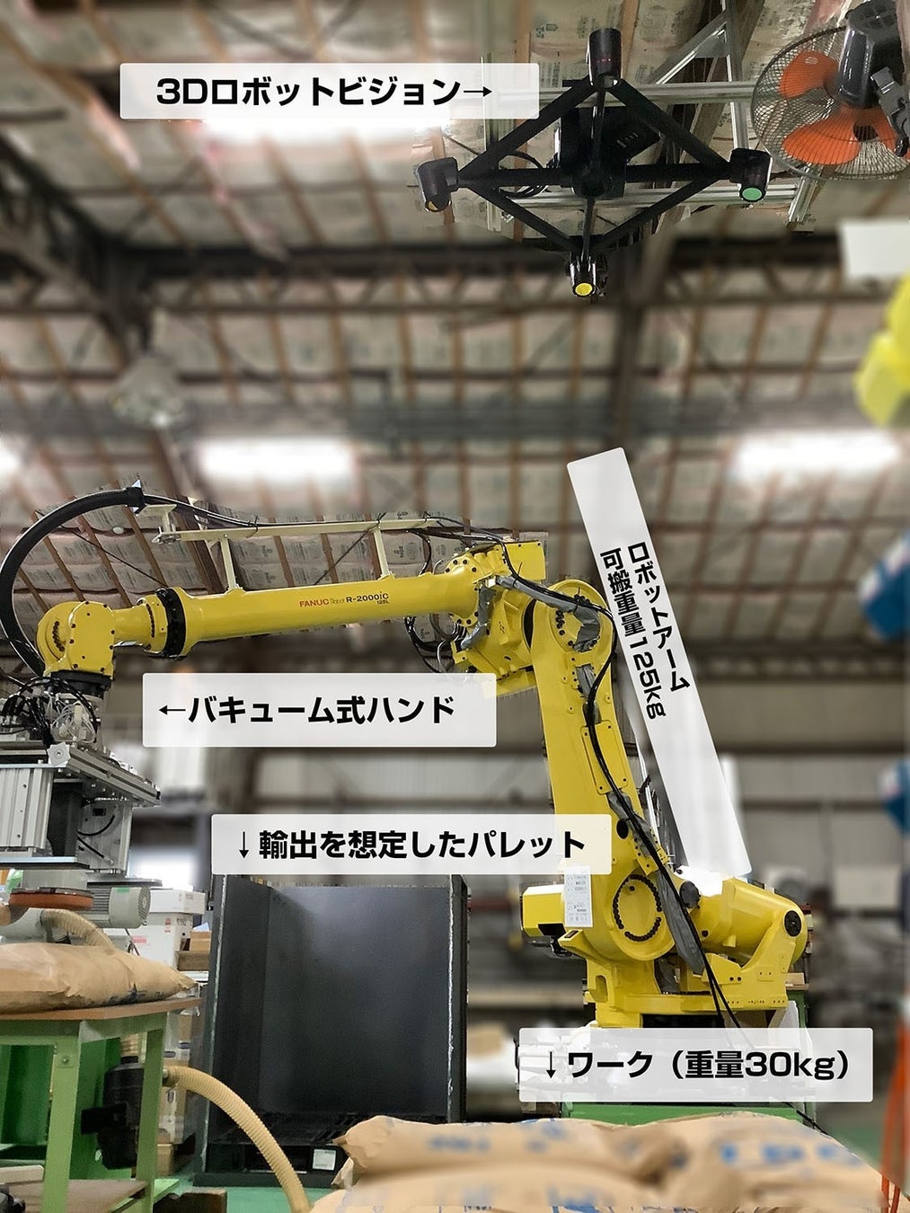 工場内での作業の一例として、重量30kgの原材料をバキュームを使って1名が運搬、もう1名が自体重用いて圧縮するという作業がありました。こうした身体的に重労働となる作業を協働ロボットが補うことによって省人化や生産の効率化を図り、また 「目」となる3Dロボットビジョンと連動することによって縦と横だけでなく高さや文字なども判別し、取りこぼしを防ぎます。