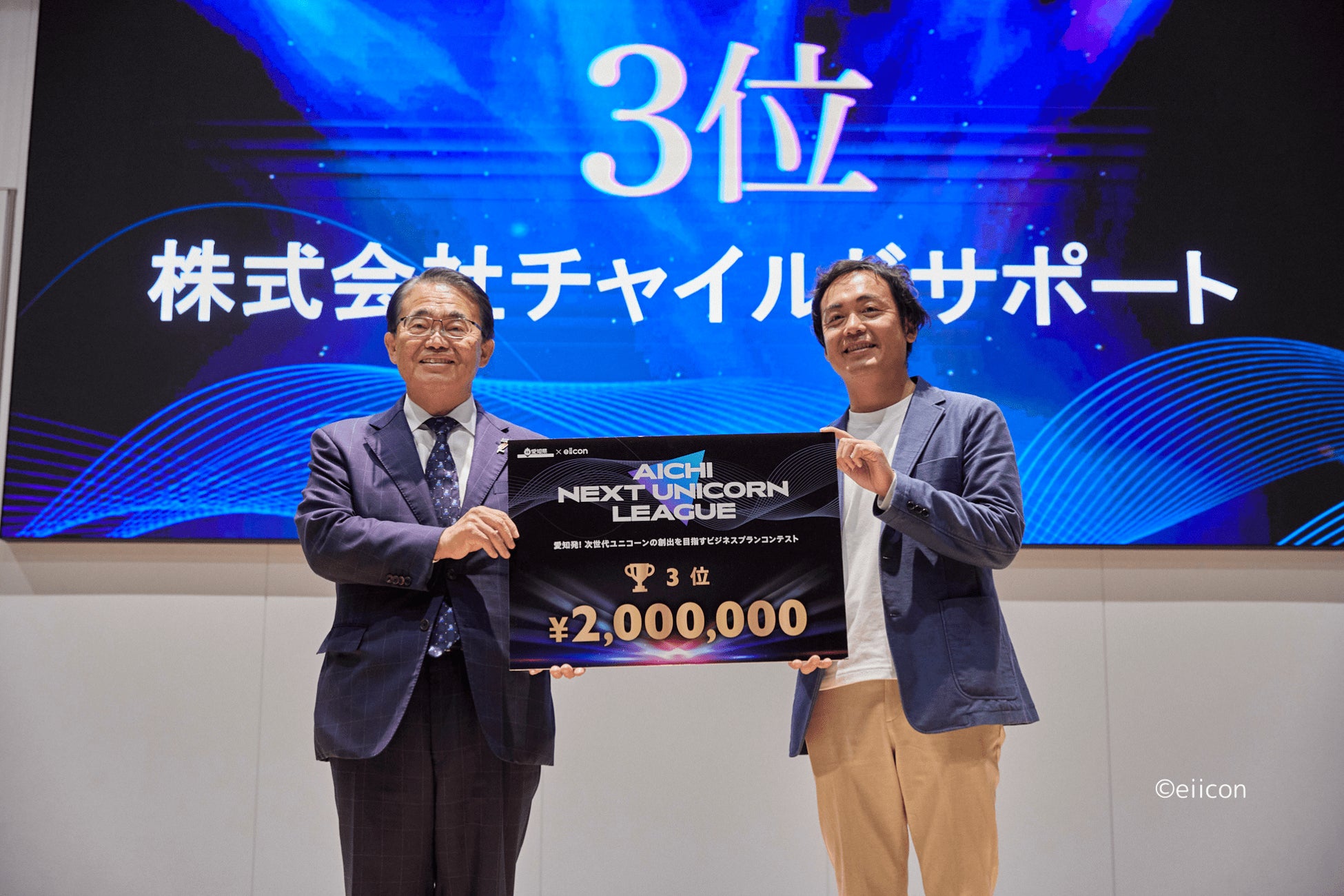 株式会社チャイルドサポートは、愛知県から次世代ユニコーンの創出を目指すビジネスプランコンテスト『AICHI NEXT UNICORN LEAGUE(主催:愛知県、運営:eiicon)』シーズン2にて、2024年11月27日に行われた「ソーシャルイノベーション(防災・まちづくり/ヘルスケア・ウェルビーイング など)」をテーマにしたピッチコンテストにて優秀賞を受賞し、大村秀章愛知県知事から表彰、賞金200万円を授与されました。