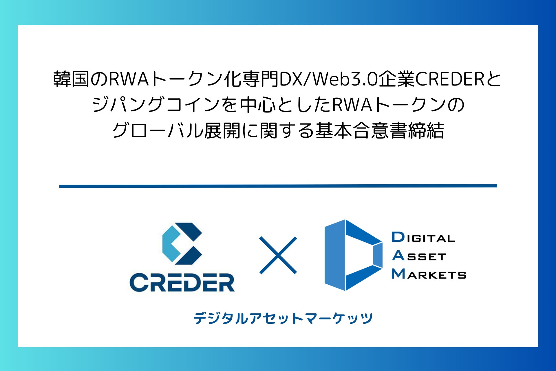 株式会社デジタルアセットマーケッツ(本社:東京都千代田区、代表取締役:西本一也、以下「デジタルアセットマーケッツ」)は、韓国においてRWAトークン化を専門とするDX/Web3.0企業CREDER Inc.(本社:韓国 ソウル、CEO:James Im、以下「CREDER」)と基本合意書を締結したことをお知らせします。本合意書により、当社が発行支援するジパングコイン(三井物産デジタルコモディティーズ株式会社が発行)を中心としたRWAトークンのグローバル展開を推進します。
