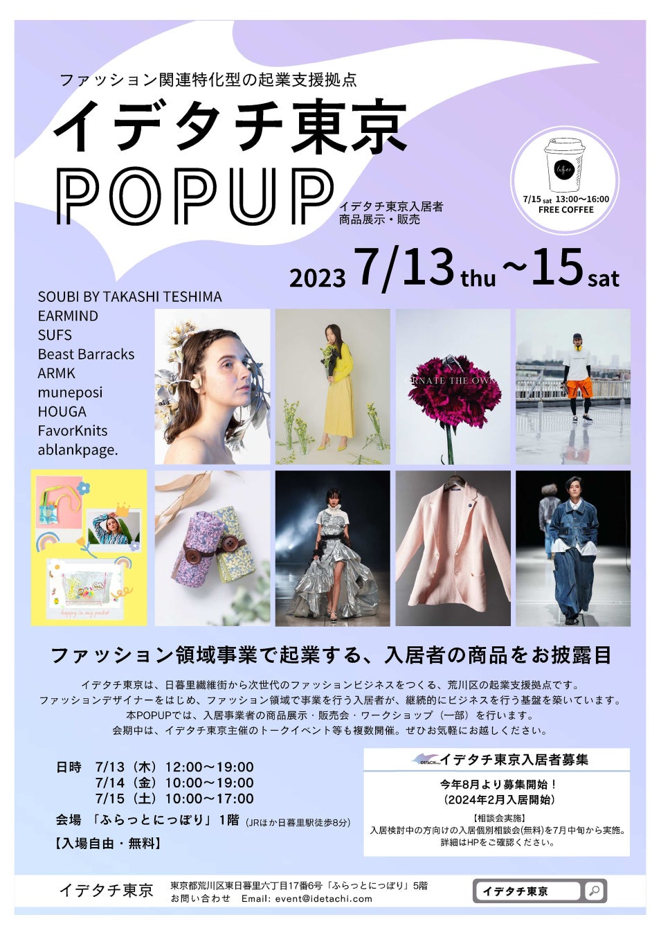 イデタチ東京では7月13日(木曜)から15日(土曜)まで、入居事業者が一堂に会し、商品展示、販売を行う「イデタチ東京POPUP」を開催します。