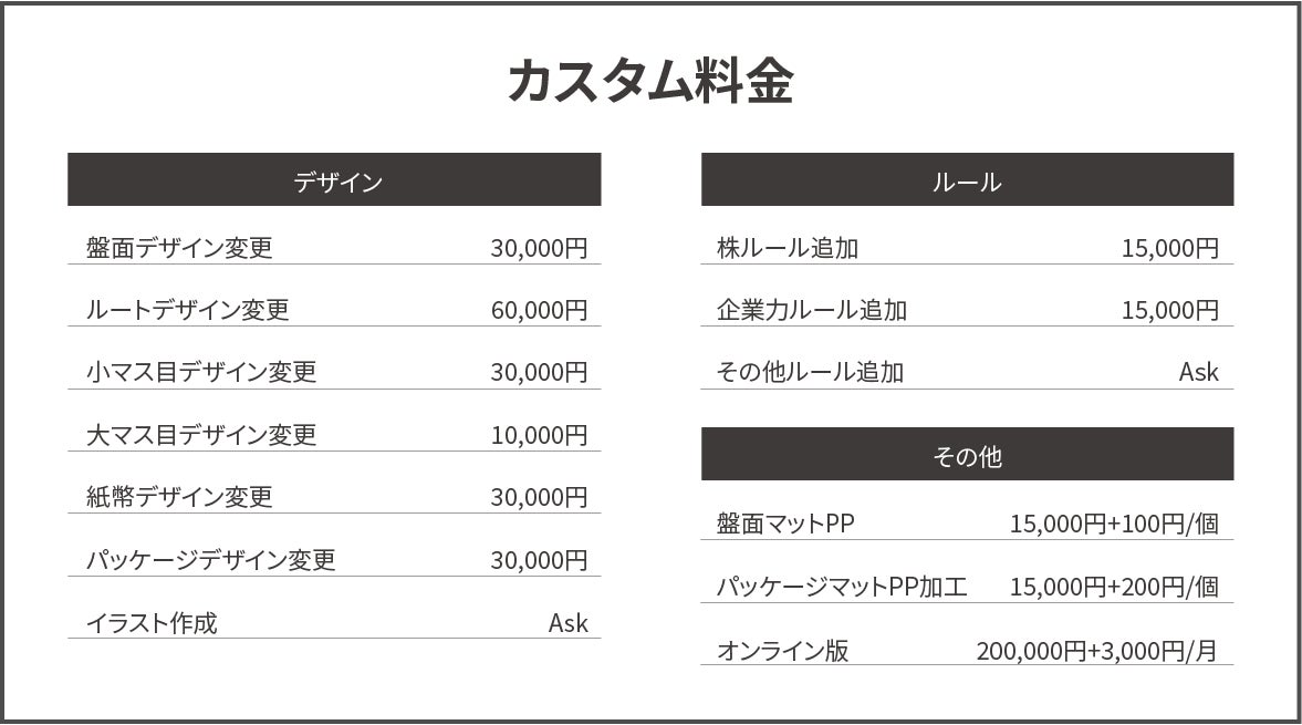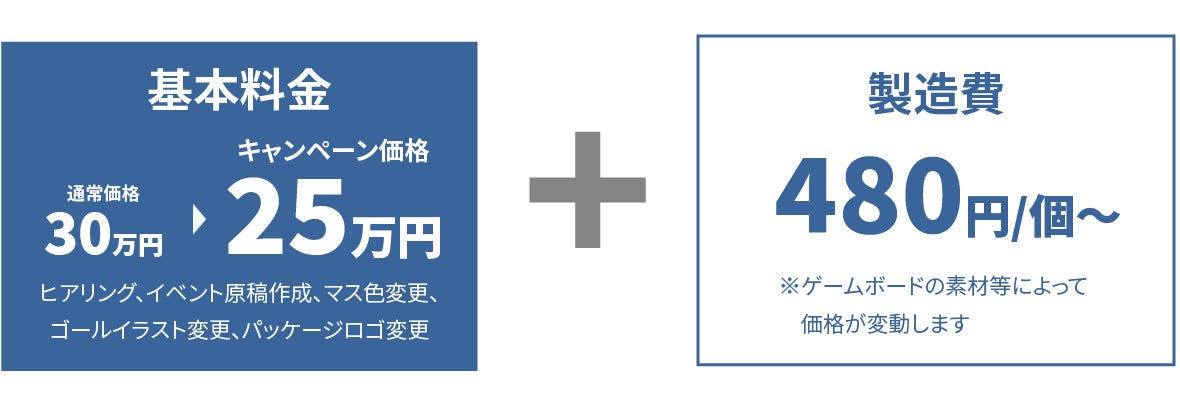 貴社オリジナルの沿革ゲームを制作するための料金は、基本料金30万円(リリースキャンペーン価格25万円)に製造個数や素材によって変動する製造費(480円/個~)を加えた価格となります。
