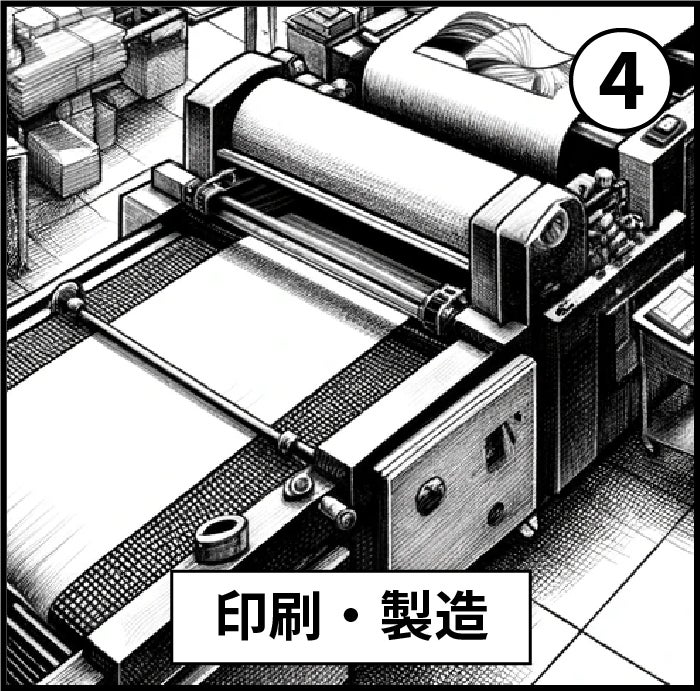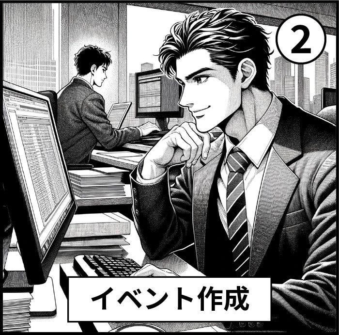 当サービスの流れは「企業様へのヒアリング」、「イベントの作成」、「デザインの制作」、「印刷・製造」となっております。