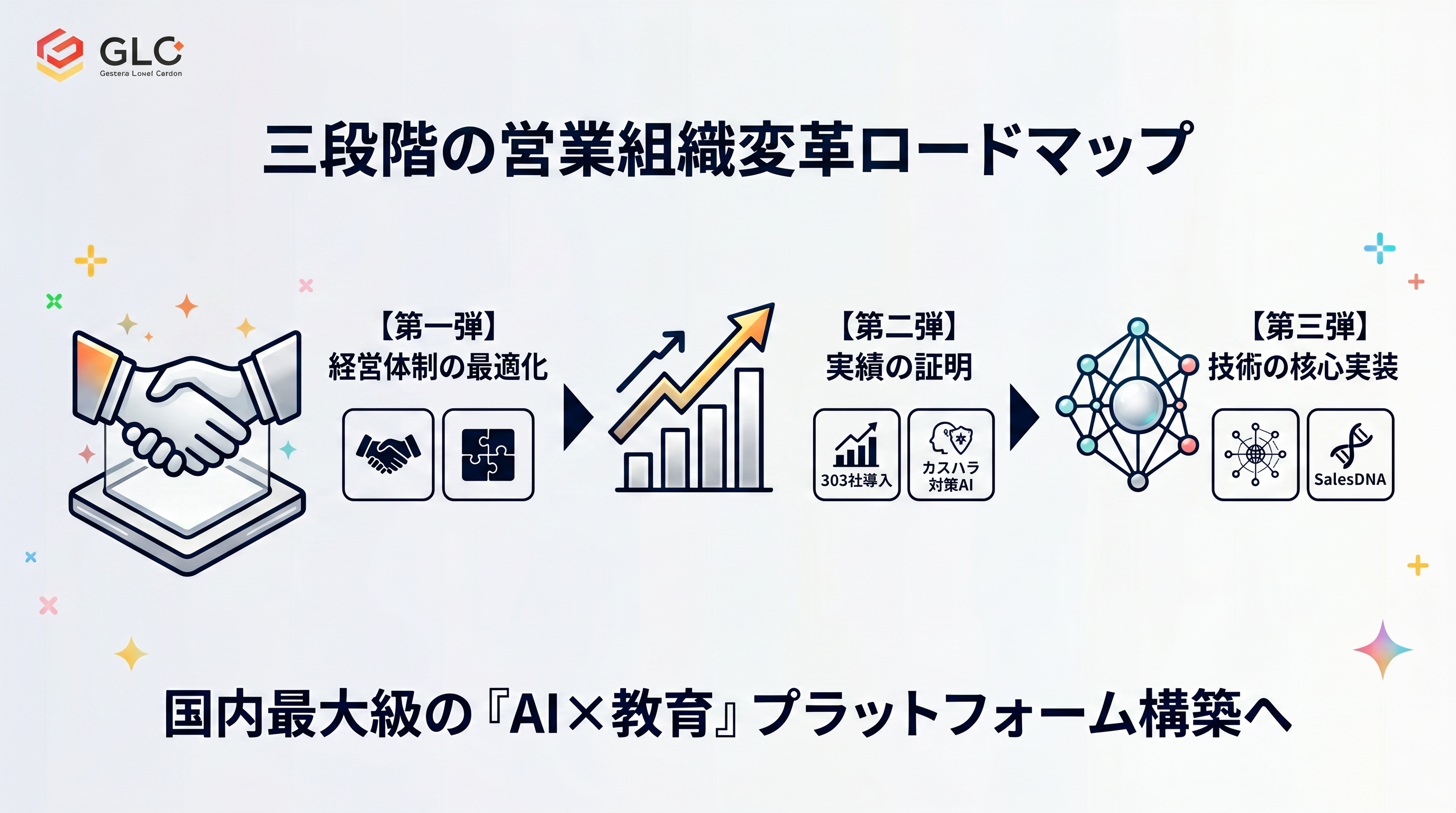 GLキャリア株式会社は全株式を取得し、完全独立体制へ移行しました。営業DX技術と教育ノウハウを融合させ、国内最大級の「AI×教育プラットフォーム」の構築を加速し、企業の組織変革を強力に推進します。