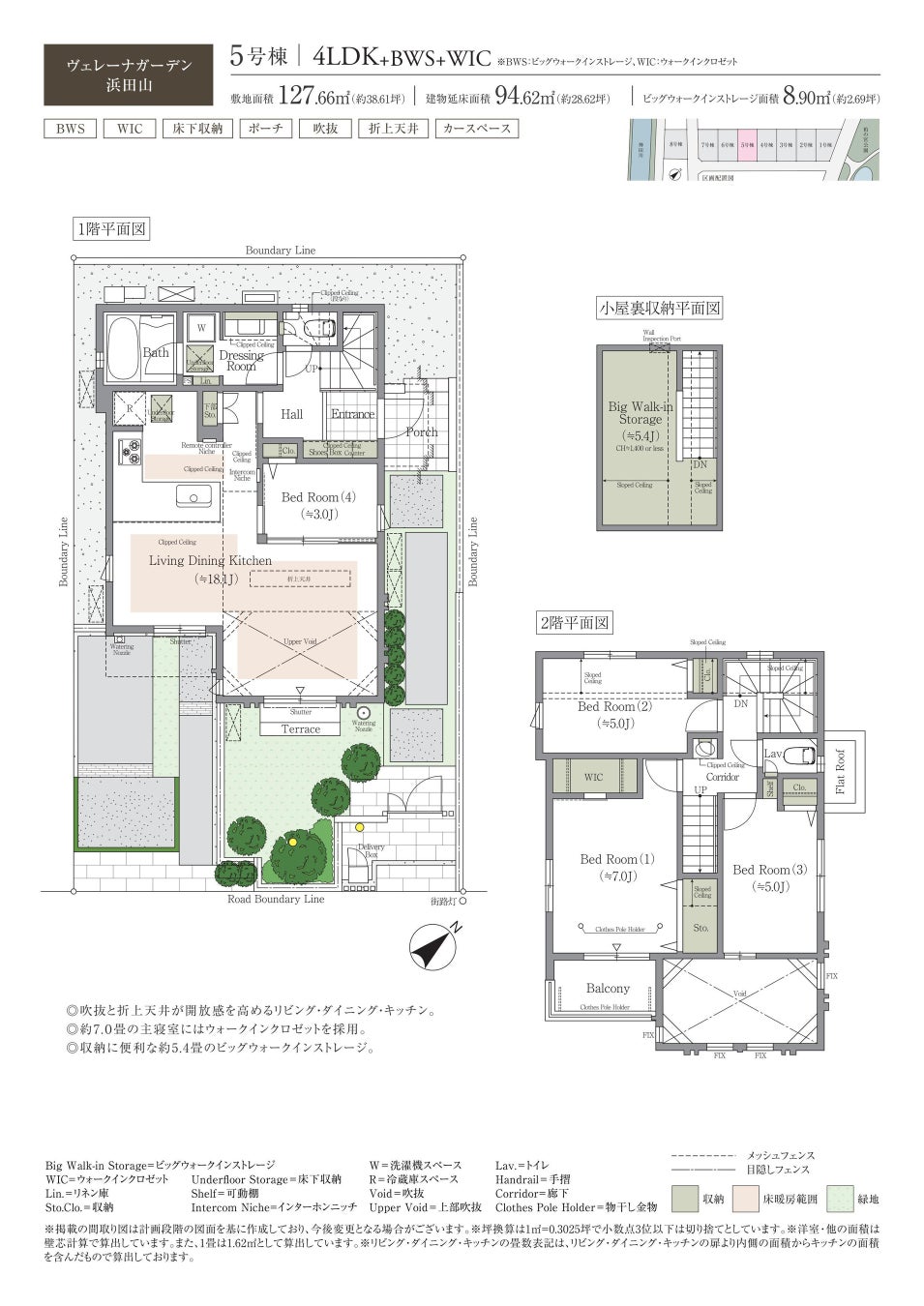 (2) 127㎡台~137㎡台の敷地面積に全邸南東向き・4LDK以上を実現。開放的な吹抜のリビングプランや全邸に小屋裏空間を利用した「ビッグウォークインストレージ」を採用