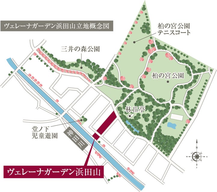 「ヴェレーナガーデン浜田山」は、京王井の頭線「浜田山」駅周辺の賑わいを抜け、穏やかな邸宅街として落ち着いた景観が広がる第一種低層住居専用地域に立地。約4.3haの広大な敷地を有し、自然の営みや防災機能も充実した「柏の宮公園」には、徒歩1分という近さ。