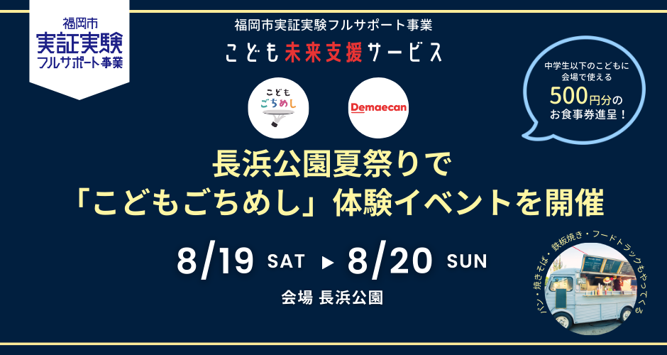 実証実験の開始に先立ち、8月19日(土)・20日(日)に福岡市内の長浜公園にて開催される「長浜公園夏祭り」にて、「こどもごちめし」を体験できるブースを出店します。本イベントを皮切りに「こども未来支援サービス」の実証実験を開始します。