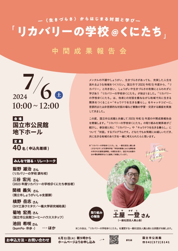令和6(2024)年7⽉6⽇、「リカバリーの学校@くにたち」の取り組み報告や関係者・報告会参加者による対話プログラムを予定
