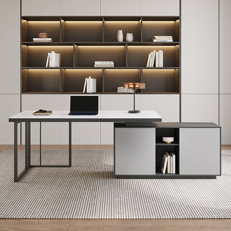 シンプルで洗練されたデザインと収納スペースの充実が魅力のワークデスクです。収納ボックスの配置を調整可能で、部屋のレイアウトに合わせて自由に使えます。高級シントレードストーン天板が、美しさと耐久性を提供します。