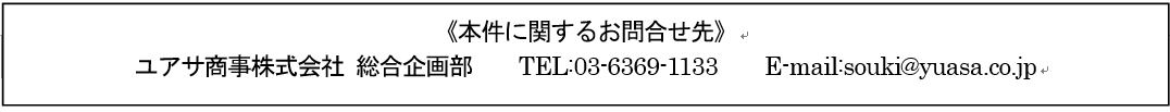 ユアサ商事株式会社 総合企画部 TEL:03-6369-1133 E-mail:souki@yuasa.co.jp