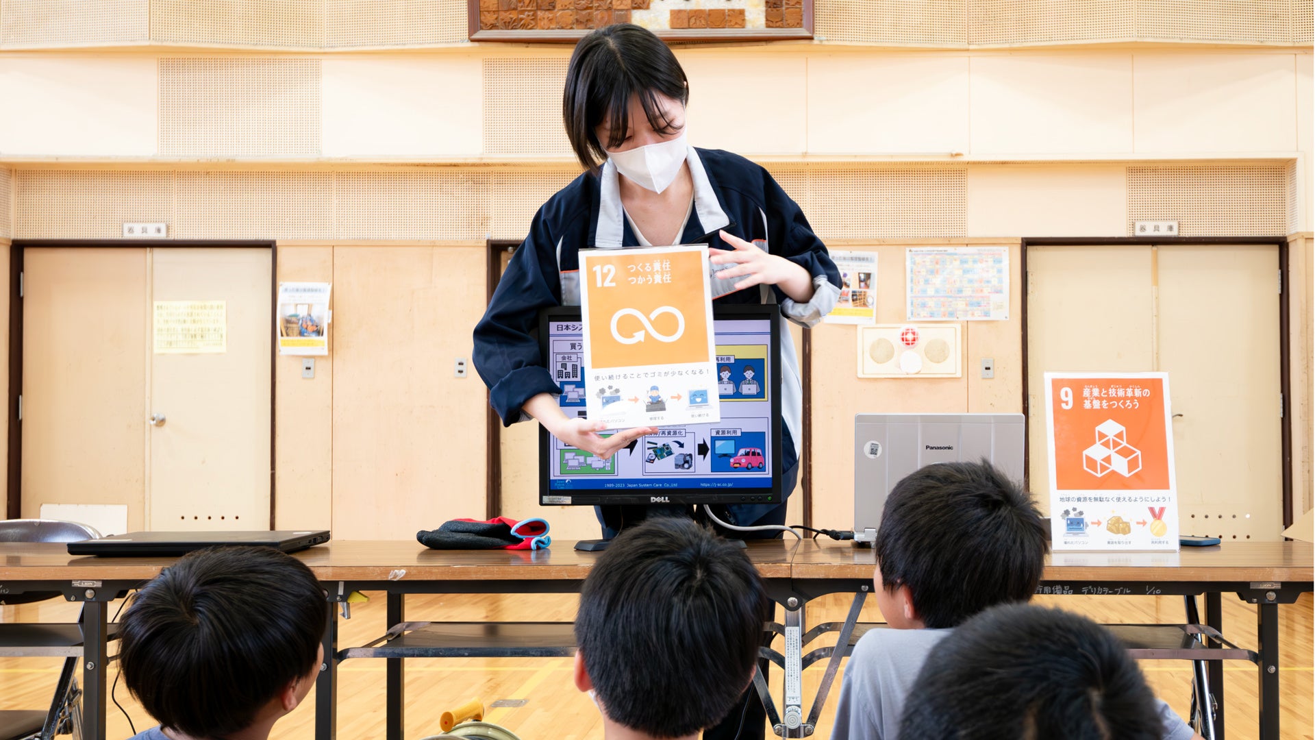 授業では、小学校4年が学ぶSDGs(持続可能な17つの開発目標)の内、当社のビジネスに関連する、2つの開発目標「9.産業と技術革新の基盤を作ろう」と「12.つくる責任、つかう責任」を題材に、リユース・リサイクルの大切さを学ぶ授業を行いました。