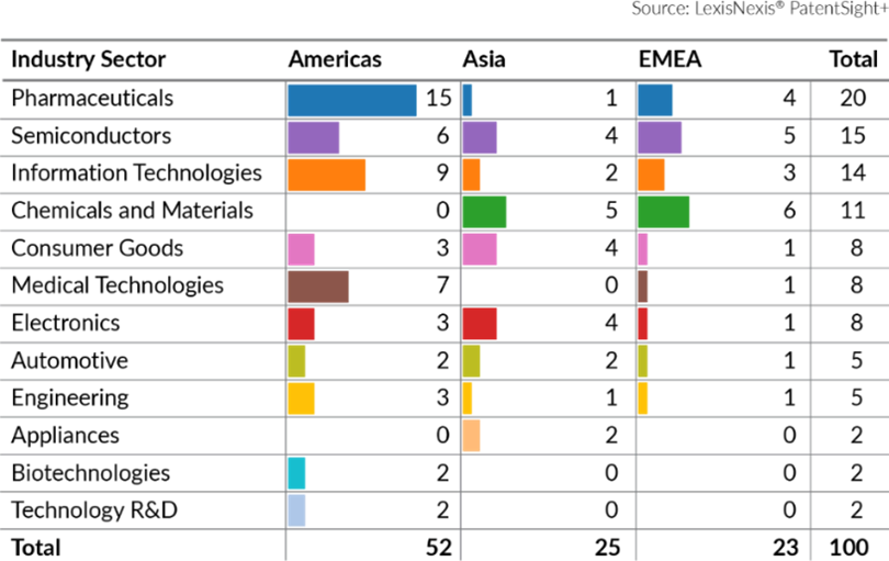 1.業界分布: 製薬業界は一貫したイノベーションで首位を維持。半導体は、パンデミックを契機としたデジタル化ニーズに支えられ、力強い成長で2位をキープしている。