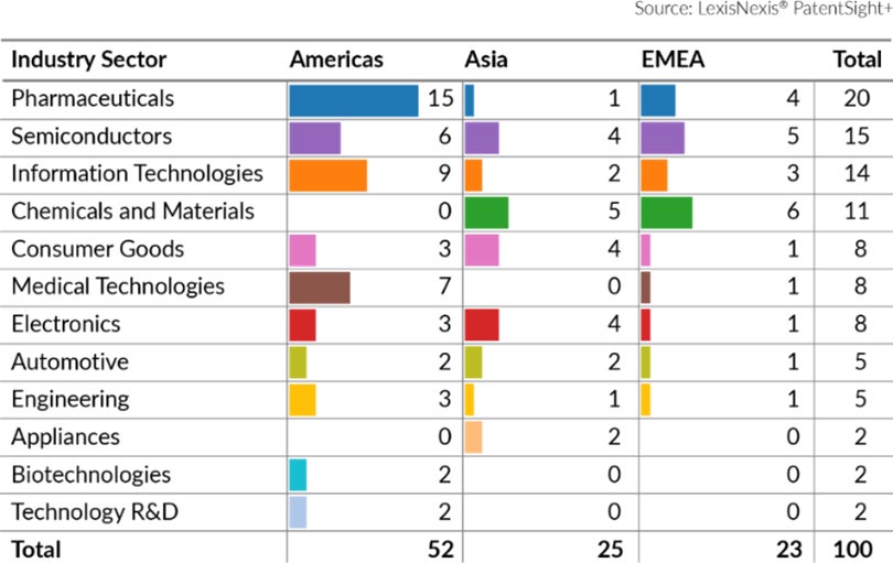 6.イノベーターのグローバル分布: 米国企業は医薬品と情報技術に優れ、アジアはエレクトロニクスと半導体で優位を占めている。特筆すべきは、中国と韓国が依然としてアジアの強国であるのに対し、中国本土の企業が昨年の13社からわずか7社に減少した。