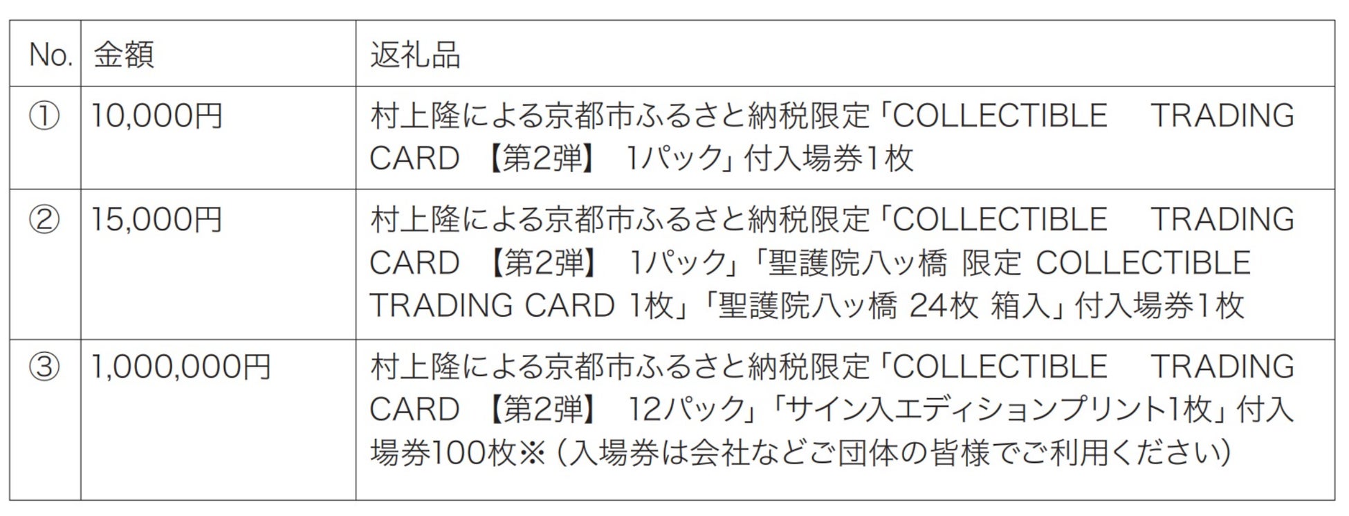 京都市ふるさと納税返礼品として京都市美術館 90 周年記念展「村上隆 もののけ 京都」 「COLLECTIBLE TRADING CARD 【第 2 弾】」をはじめとする限定アイテムをリリース