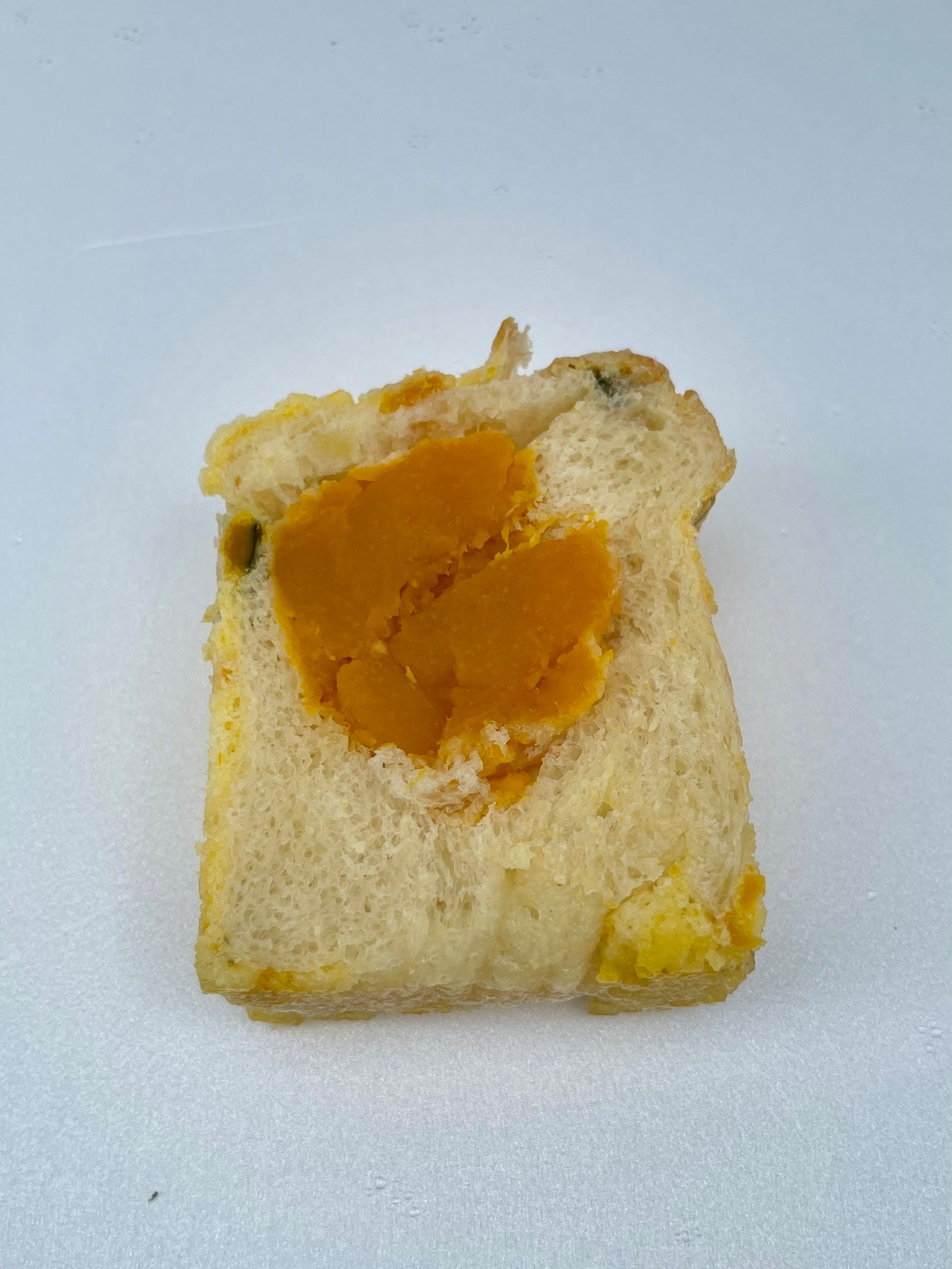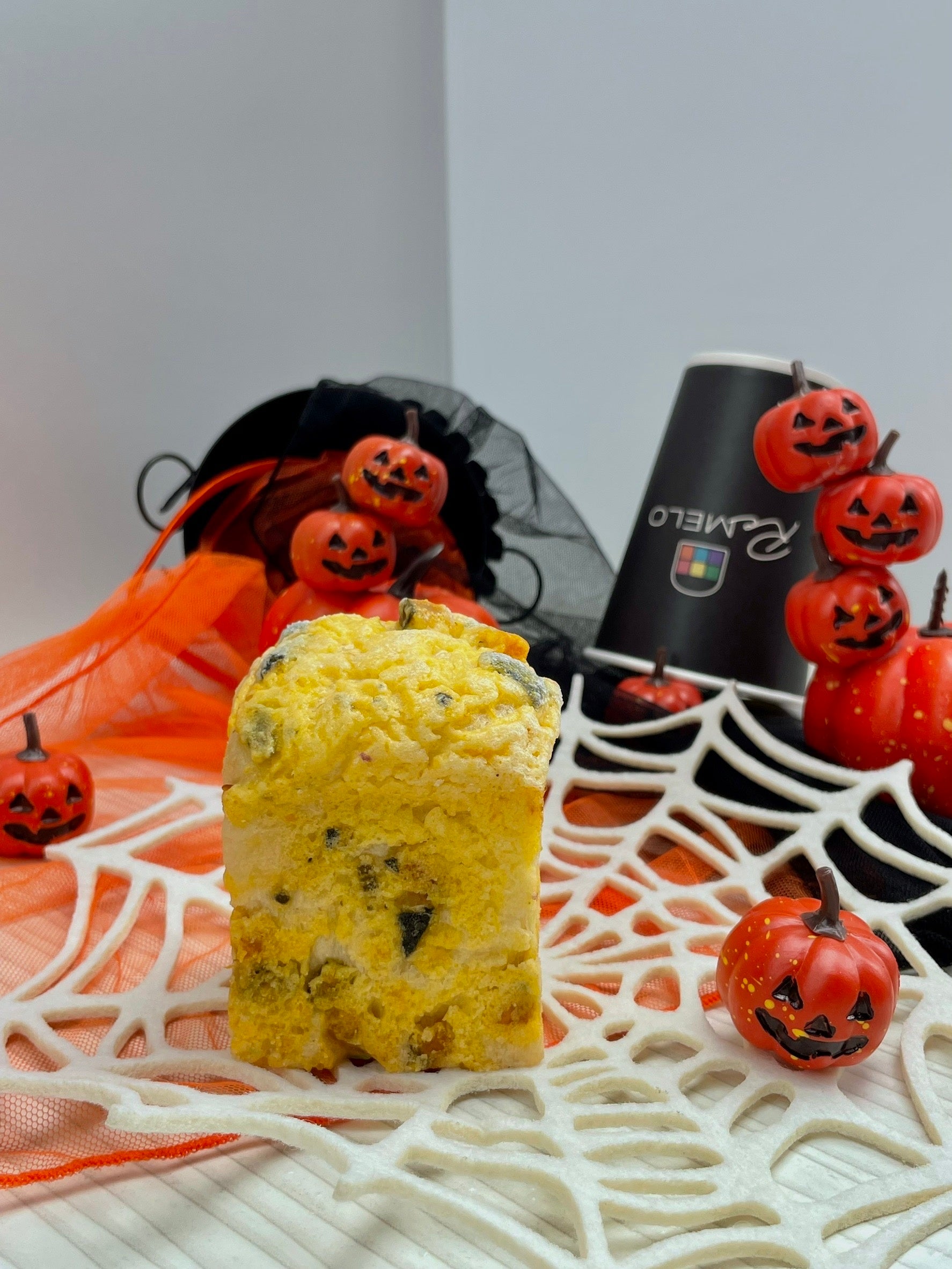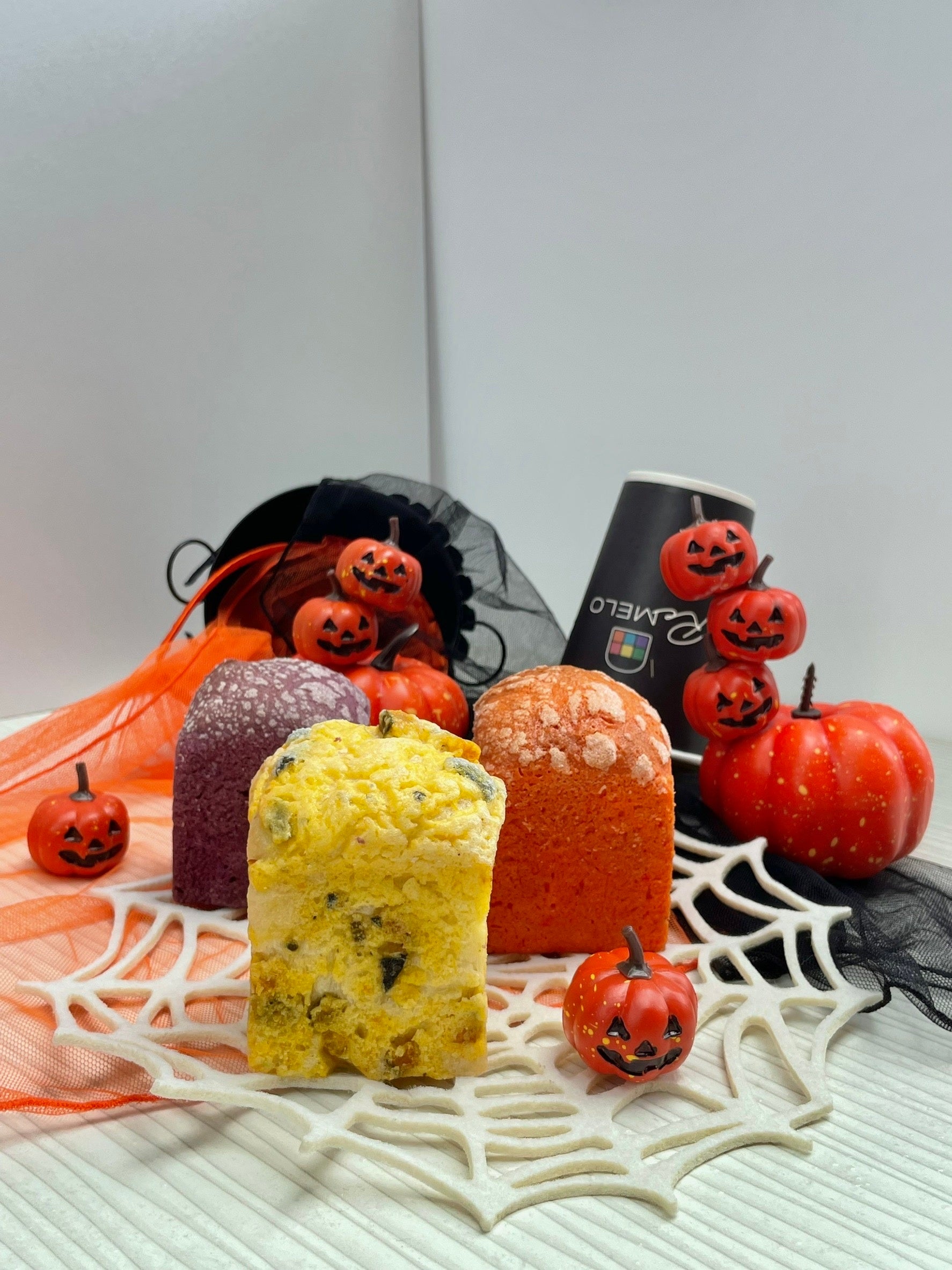 アメリカンビレッジではハロウィンも盛大に行われます。そんなハロウィンにピッタリの10月のみ発売の限定商品「パンプキンメロンパン」が登場。外側のブリオッシュ生地には国産カボチャをたっぷり使用し、中にも同じく国産カボチャペーストの餡がぎっしり!!どこを食べてもカボチャを感じる食べ応えのあるメロンパンに仕上げました。本当は沖縄産かぼちゃを使いたかったのですが、収穫時期が違うため(早くても12月以降)やむなく断念。人気次第では沖縄かぼちゃを使ってリニューアルもあるかも!?応援よろしくお願いします。
