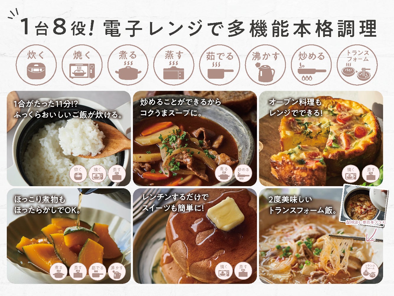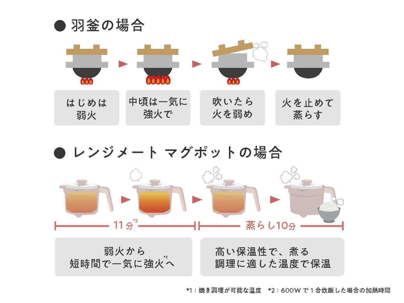 火を使わずにレンジで焼き調理ができる「レンジメート プロ」の特許構造*2はそのままに、深型のポット型になることで、ふっくらしたお米やコクのあるスープ、オーブンが無いとできなかったケーキなどの調理も可能に。短時間で高温になる特殊構造により加熱時間たったの11分*3でお米が炊けるので、地球環境に配慮した短時間メニューでSDGsへの取り組み強化も目指します。高い保温構造で料理が冷めにくいのも魅力。ついつい作りすぎてしまう煮物も、マグポットなら食べたいときに必要な分だけ調理が出来るので嬉しいポイントです。「レンジメート プロ」と合わせて使用すれば、たったの15分*4で焼き魚と白米の定食が作れます。老若男女を問わず、お料理苦手な方や一人暮らしの方、家族の食事の時間が合わず大変なお母さんにもおすすめです。もちろん、お料理得意な方にも毎日お使いいただけます。ご自身用としてはもちろん、新生活や引っ越し、結婚のお祝いなどのギフトにも喜ばれる製品です。