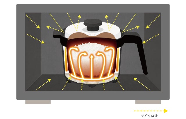 レンジメートシリーズの特徴である、本体内部の特殊発熱体がマイクロ波に反応し、発熱。 短時間で釜内部を高温に到達させることができるので、電子レンジでお鍋のような調理が可能です。