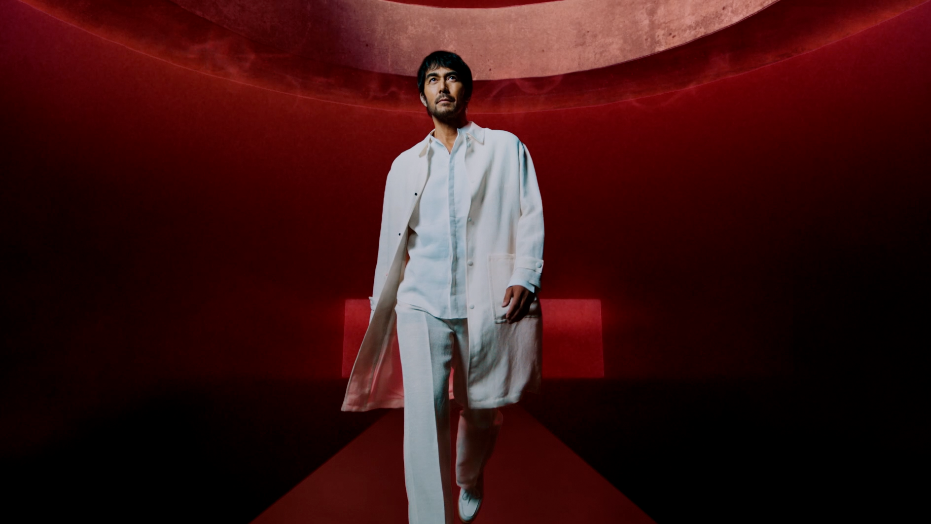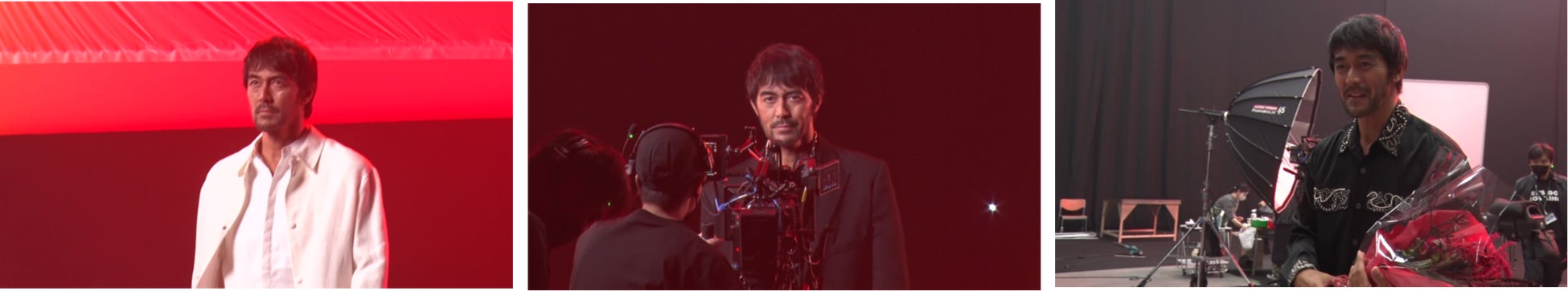 撮影当日、阿部寛さんはシャープなシルエットの白い衣装を身にまとい、撮影現場に登場。今回の撮影の多くが、赤いライトに照らされた、黒いセットの中で行われました。モニターを真剣な表情で確認する阿部さん。撮影中は声のトーンや表情、動きについて監督と入念な確認を行っていました。ひとたび撮影が始まると、阿部さんは今回の「目の前のことに全力で挑み続ける男」という役柄に集中し、制作スタッフ一同思わず引き込まれるほどの圧倒的な存在感を放っていました。特に、ランウェイを歩くシーンでは衣装チェンジを複数回行いつつの撮影となりましたが、それぞれの衣装によって表情や歩くスピードを変えるなど、セリフはなくても思いが伝わるその演技力は印象的で、今回「Cook Do®」がこだわり抜いて開発した新商品のコンセプトをまさに体現していました。