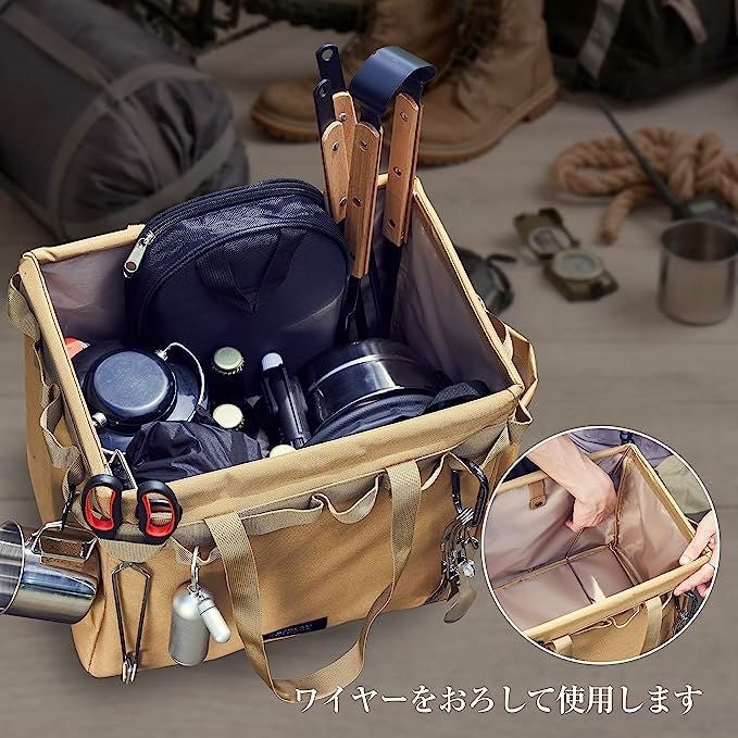 また、あえて本体上面に蓋を設けず開放することで、製品以上の高さのある火かき棒セットや薪木などのキャンプ用具も収納可能に。