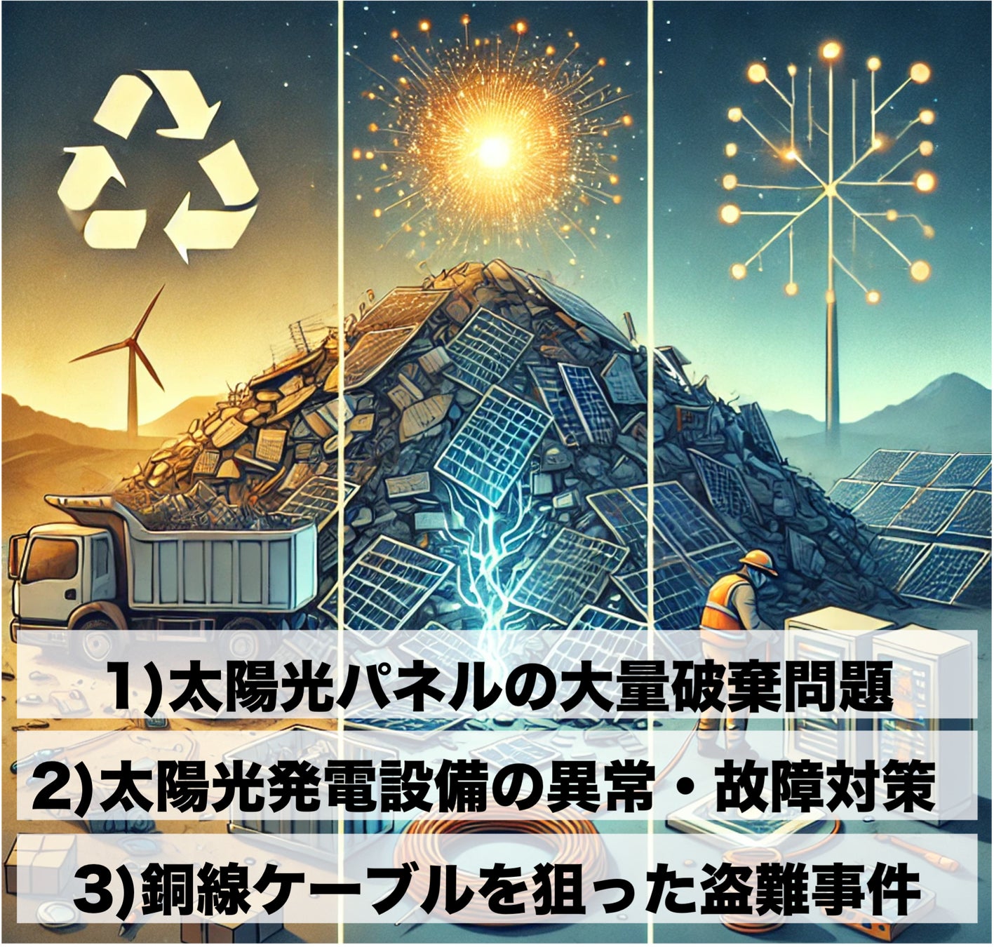 また、現在、多くの太陽光発電設備において、様々な故障や異常が発生しており、発電量異常においても、パネルの故障や配線接触不良、獣害や人害、天気によるケースがある。その他にもパワーコンディショナーの異常、故障やブレーカーの問題もある。