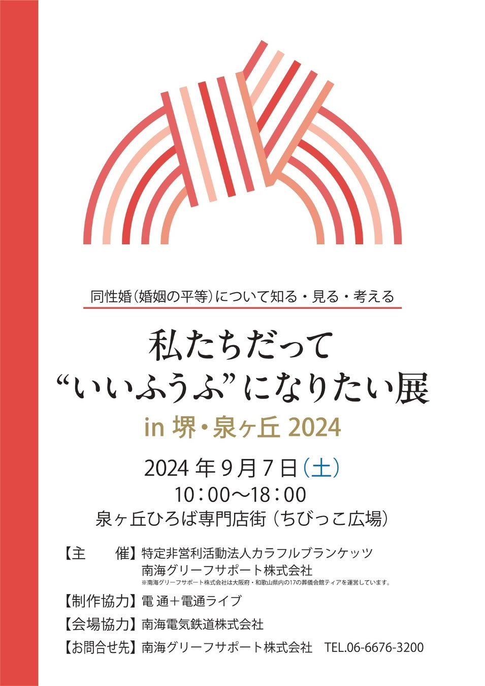 南海グリーフサポート株式会社<南海電気鉄道100%出資>(取締役社長:小池 裕司)は、2023年6月より性的少数者が安心して葬送儀礼を行えるようLGBTQフレンドリーを掲げており、この度、同性婚の法制化(婚姻の平等の実現)に向けて、特定非営利活動法人カラフルブランケッツと共同で2024年9月7日(土)に泉ヶ丘ひろば専門店街(ちびっこ広場)に於いて、「私たちだって“いいふうふ”になりたい展in堺・泉ヶ丘2024」を開催いたします。この展示会では「同性婚(婚姻の平等)はなぜ必要?」「同性パートナーシップ制度との違いは?」「同性カップルは何に困っている?」という疑問にお答えしますので、どうぞお気軽にお越しください。