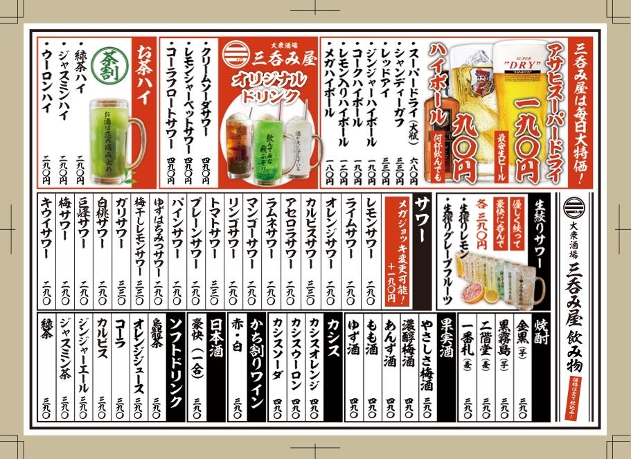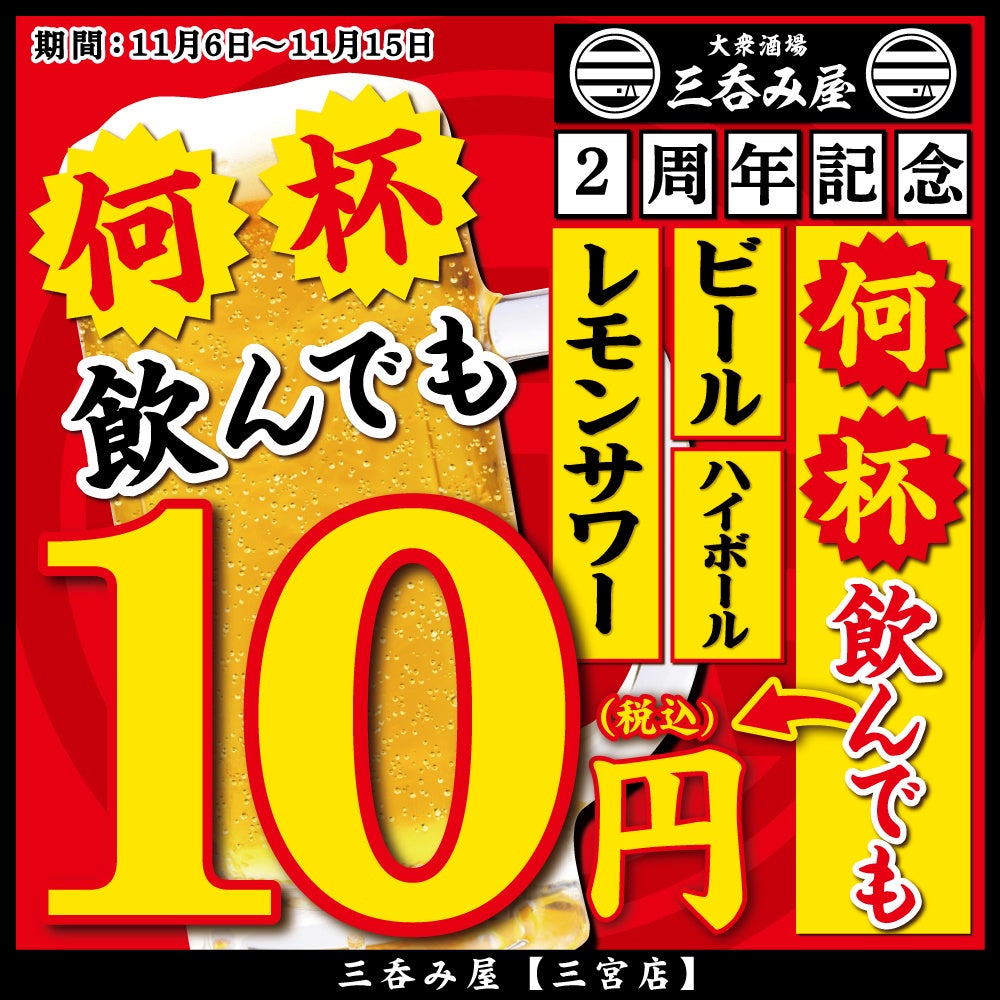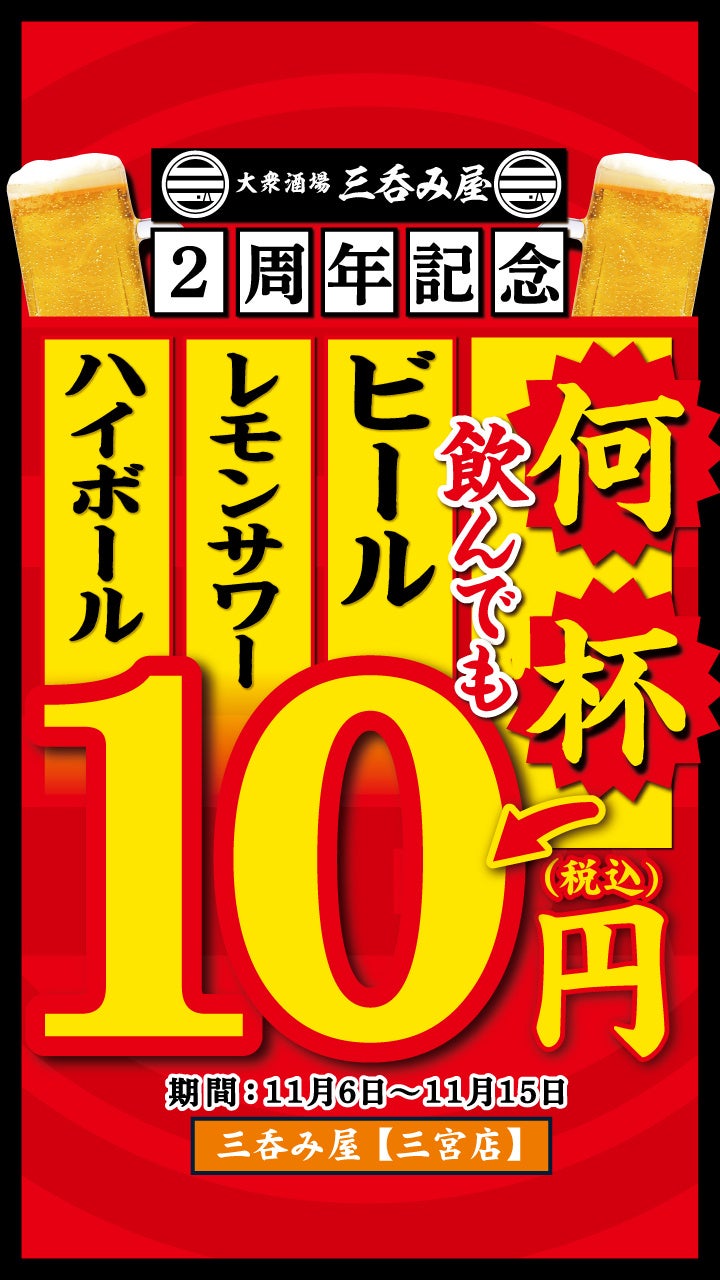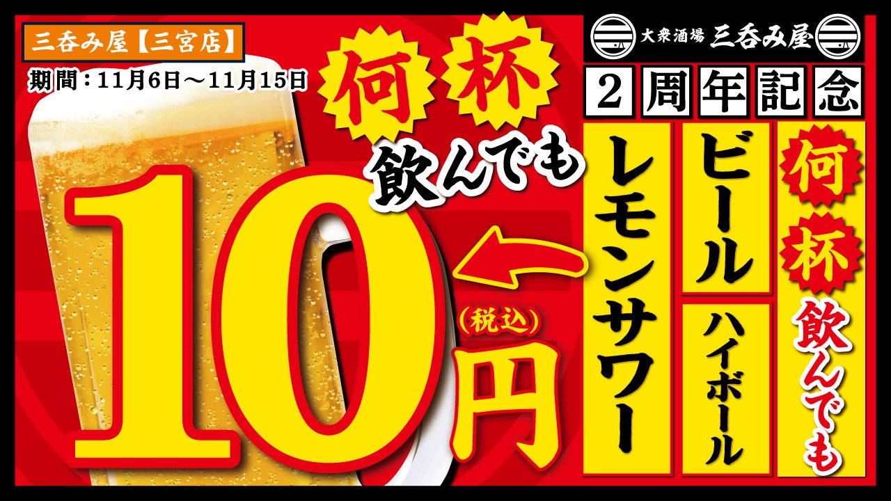 【大好評企画!生ビール・ハイボール・レモンサワーが何杯飲んでも1杯10円】オープン2周年を記念して「大衆酒場 三呑み屋 三宮店」にて11月6日(月)~15日(水)の期間限定で実施